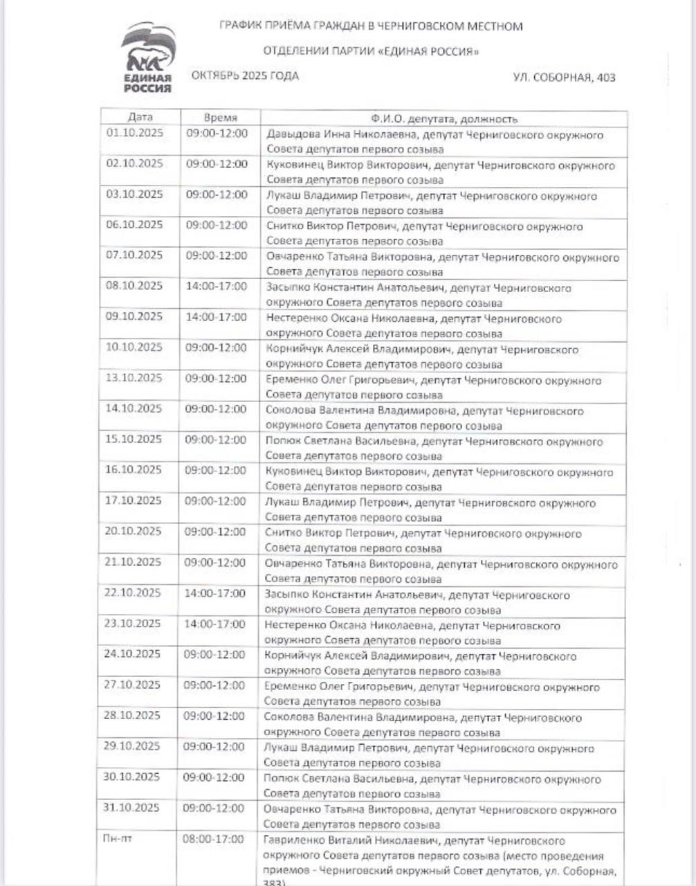 Черниговским местным отделением политической партии «Единая Россия» сформирован график приёма граждан на октябрь 2025 г.