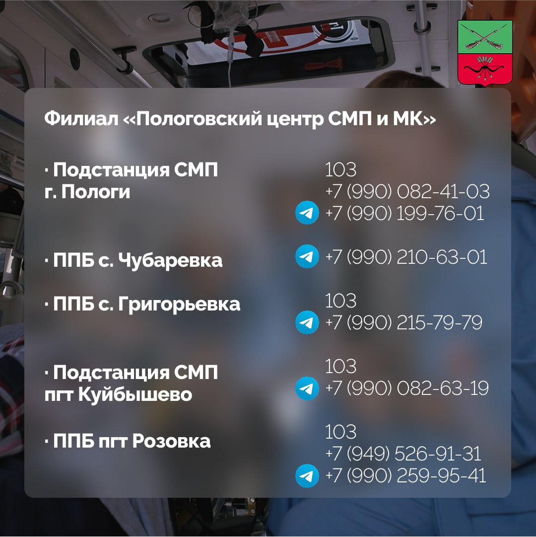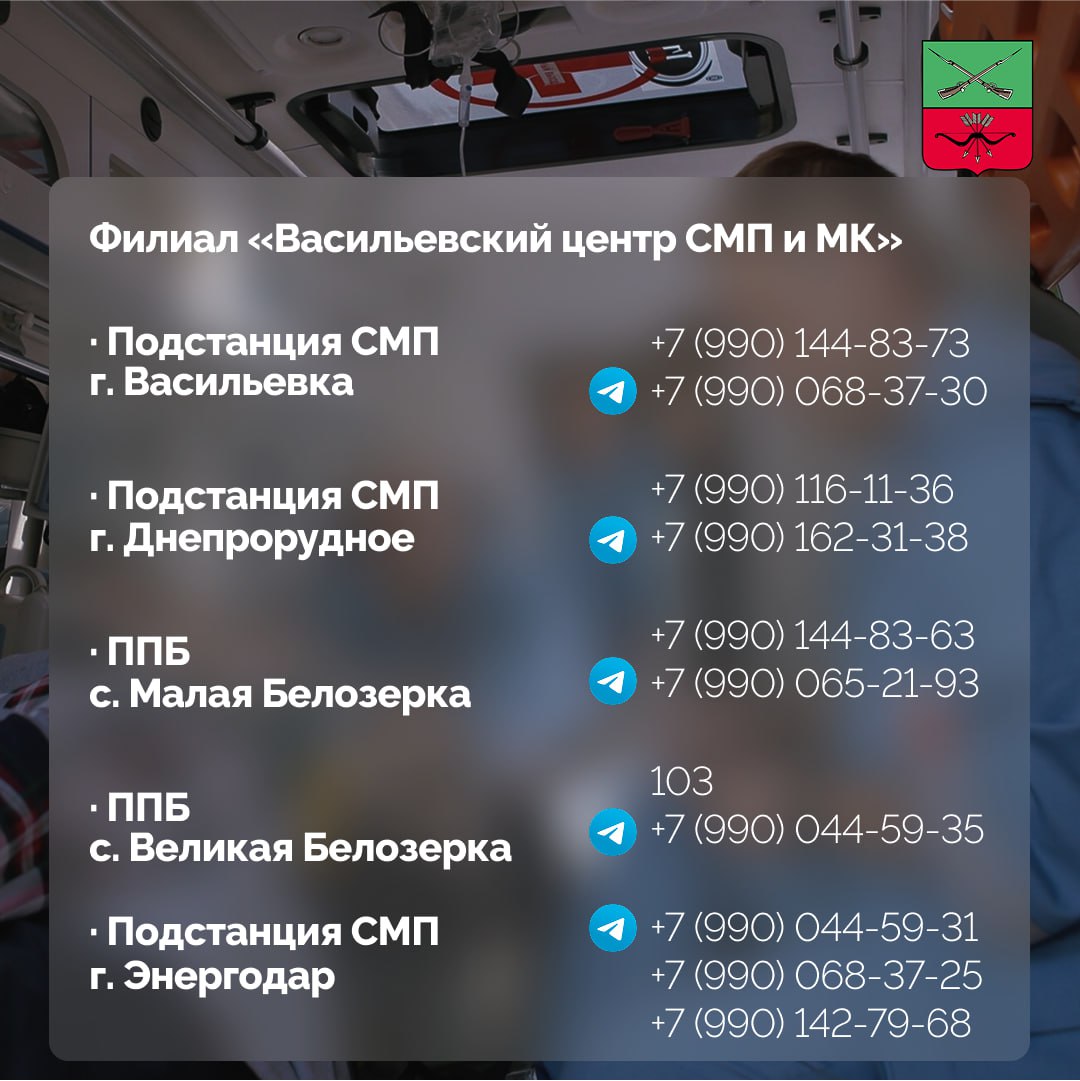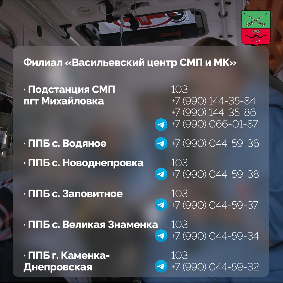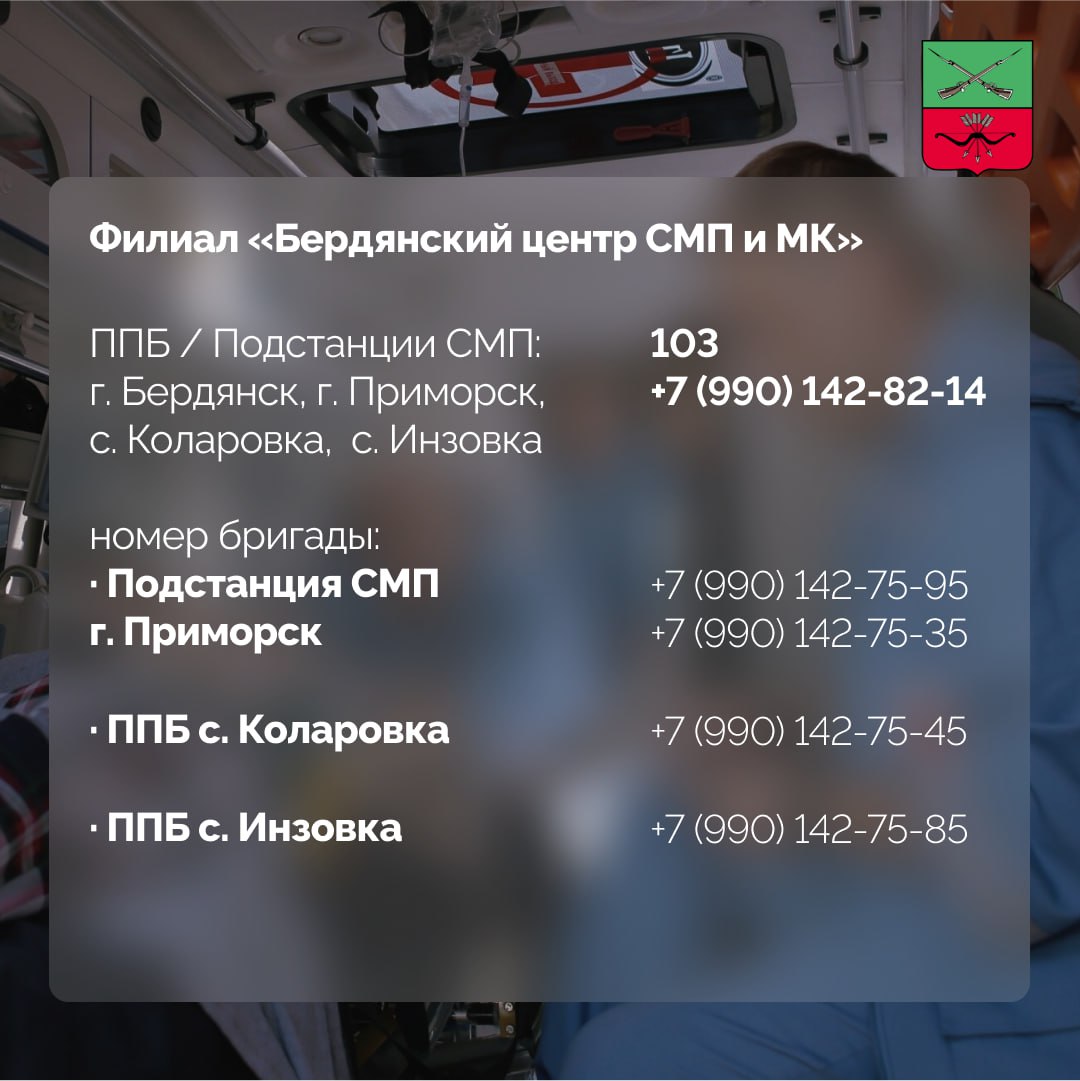 Министерство здравоохранения Запорожской области сообщает актуальные номера телефонов пунктов базирования бригад скорой медицинской помощи. В части населенных пунктов можно также связаться по вопросам оказания скорой медицинской помощи через Телеграм.