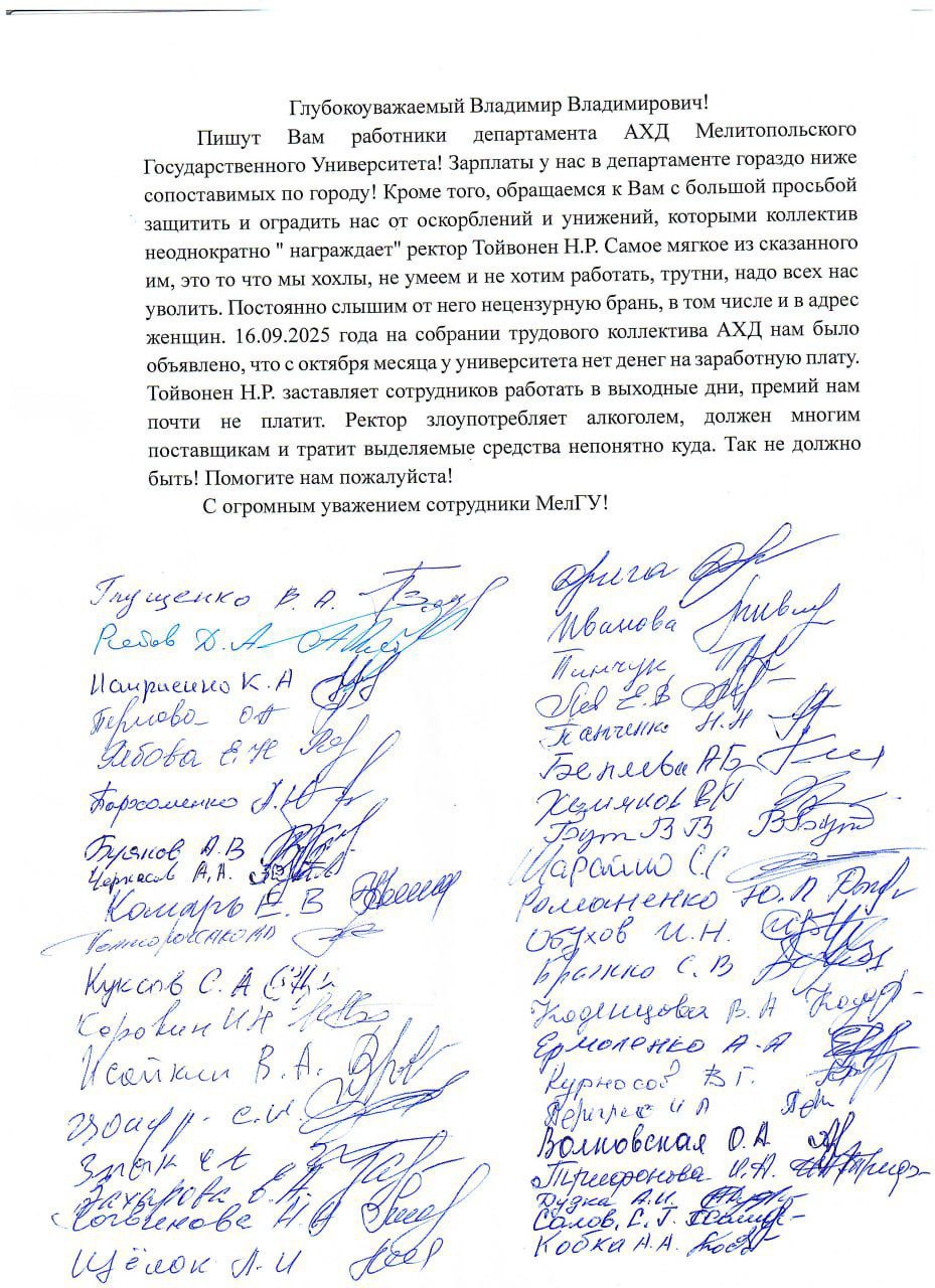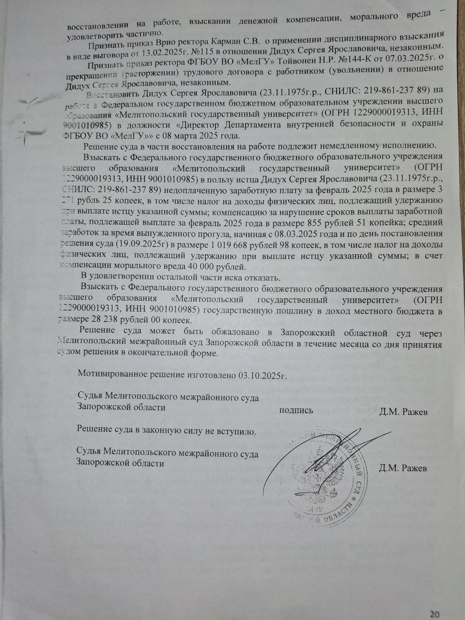 Напоминаем, что общая сумма присужденных выплат незаконно уволенным сотрудникам Мелитопольского университета уже превысила 3 миллиона рублей. И это в то время, когда сотрудникам вуза предлагают экономить заработную плату.