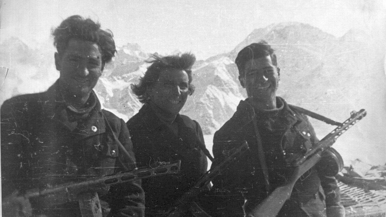На фото: А.И. Грязнов, Л.Г. Коротаева и Н.П. Персиянинов – участники штурма Эльбруса при снятии немецкого флага и водружении советского