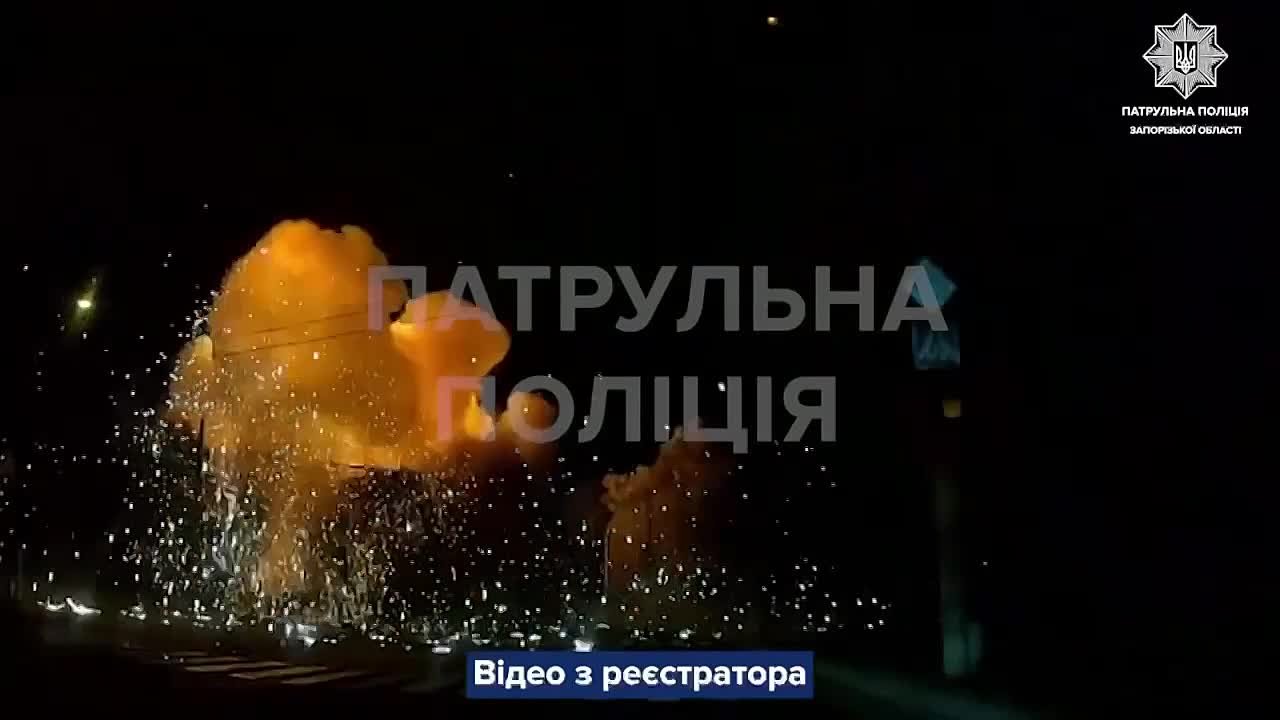 Кадры падения одного из барражирующих боеприпасов с новой зажигательной боевой частью в Запорожье в ходе ночного удара.
