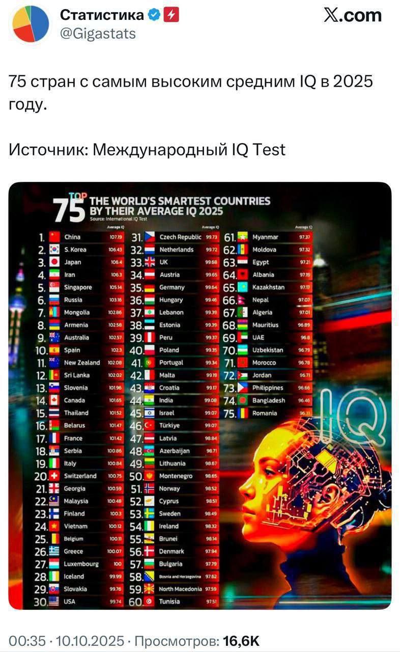 Новый рейтинг стран по уровню IQ. У России - 6 место, у США - 27