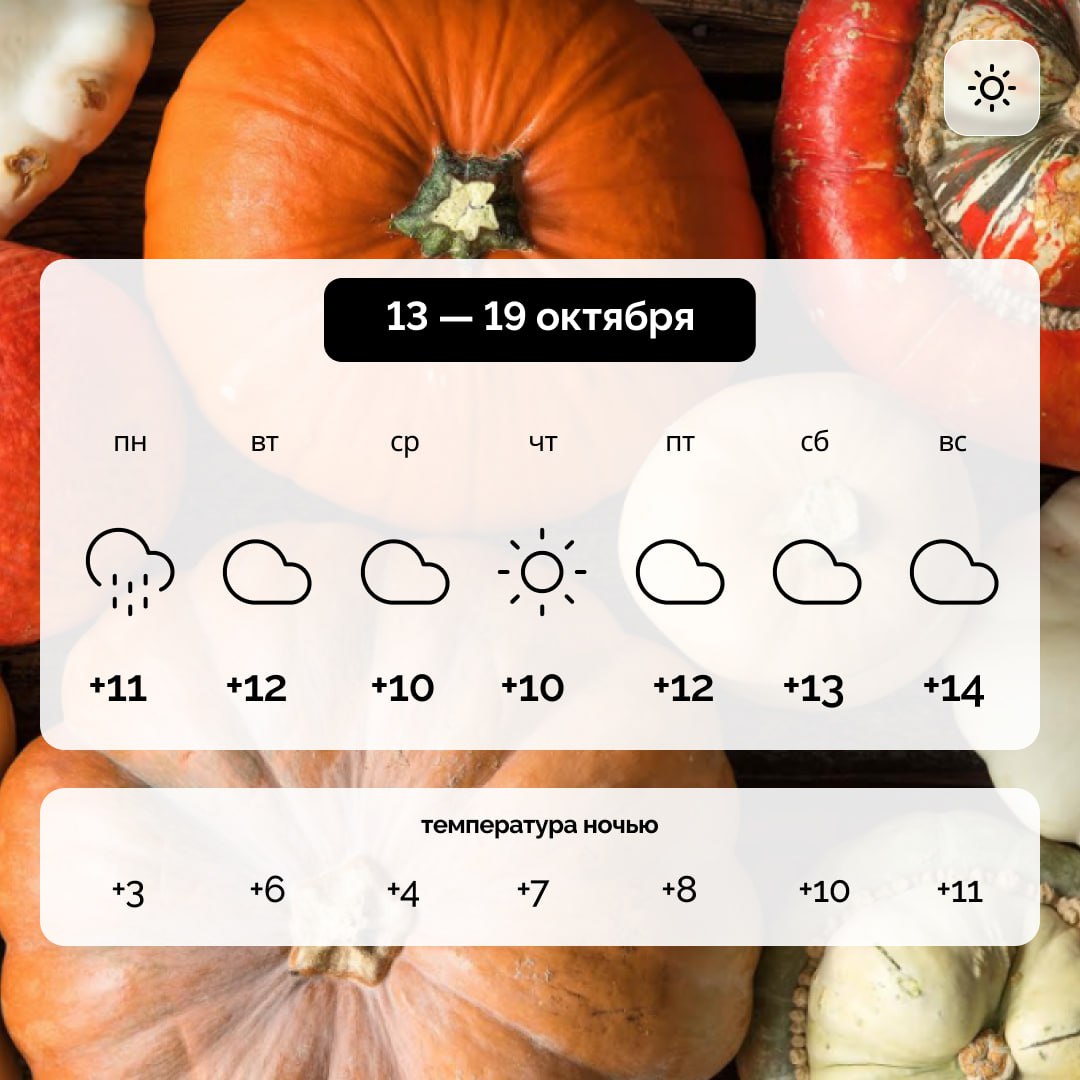 На протяжении недели температура воздуха составит +12 °C днем, а ночью температура воздуха не опустится ниже +3 °C.