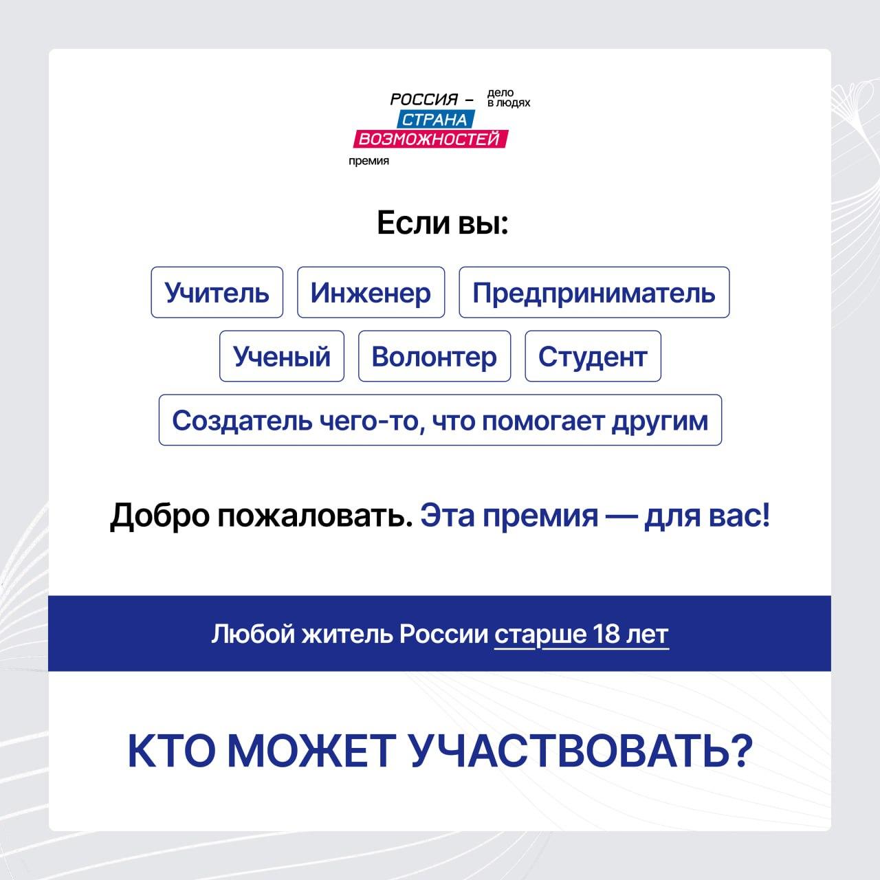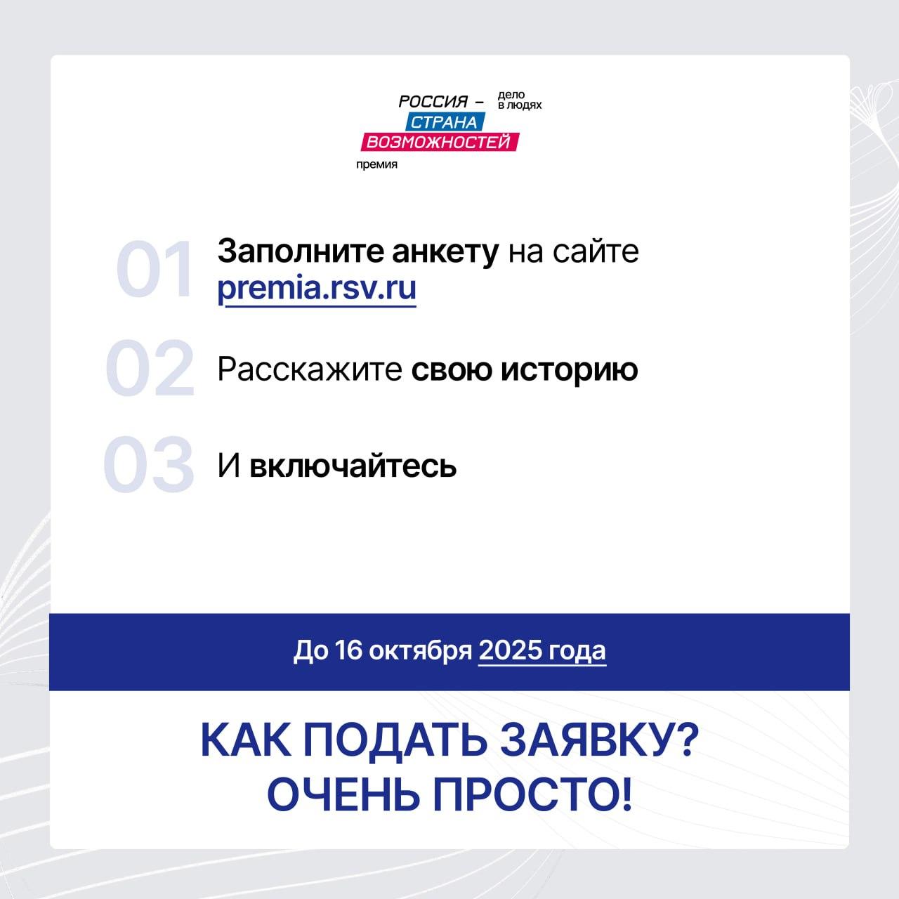 Открыт прием заявок на второй сезон Премии «Россия — страна возможностей», учрежденной по поручению Владимира Путина. Проект рассказывает о россиянах, которые меняют страну к лучшему, реализуют и создают возможности в разных сферах. Заявку можно подать до 16 октября на сайте проекта: https://premia.rsv.ru/