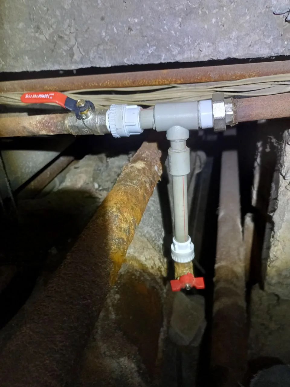 Работы проводились в подвале 4-го подъезда по адресу: ул. Орджоникидзе, 64 на стояке отопления.