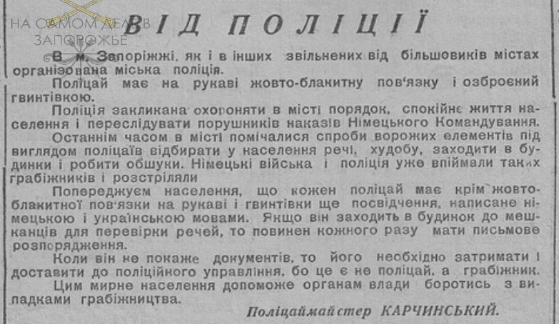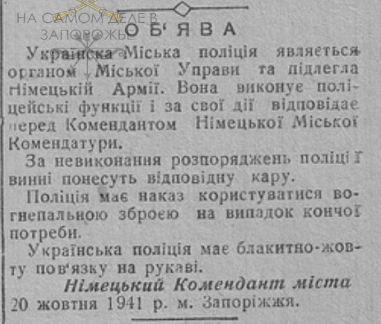 Украинская полиция имеет блакитно-жёлтую повязку на рукаве» — Немецкий комендант, г. Запорожье, 20 октября 1941 г.