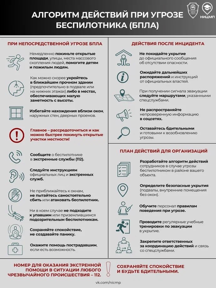 Нельзя пользоваться лифтами. Классические убежища с круглосуточным пребыванием для БПЛА-опасности обычно не используются.