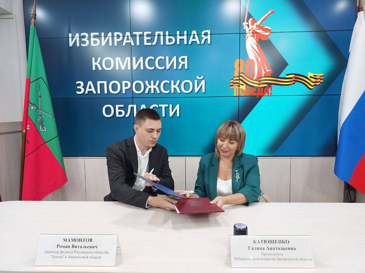Состоялось подписание соглашения с филиалом Российского общества "Знание" в Запорожской области. Директор Запорожского филиала Роман Витальевич Мамонтов и Председатель Избирательной комиссии Запорожской области Галина Анатольевна Катющенко договорились о совместной работе. Это соглашение закрепило юридически ту работу, которая уже ведётся не один месяц.