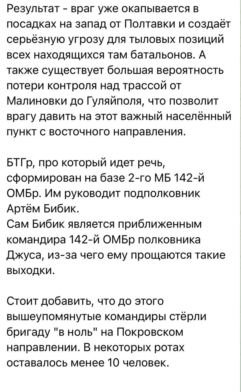 Противник сообщает о серьезных ошибках (перетасовывают пидроздилы, внося хаос в оборону) командования ВСУ на участке Успеновка-Полтавка Запорожской области, где наступает ГрВ «Восток». Итог ошибок офмцера по фамилии Бибик - прорыв наших