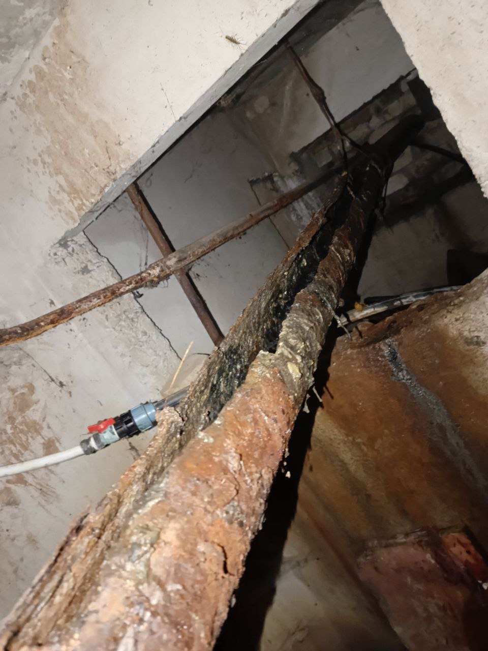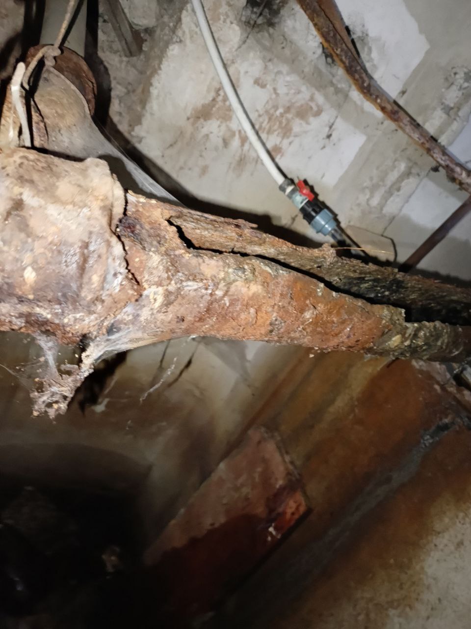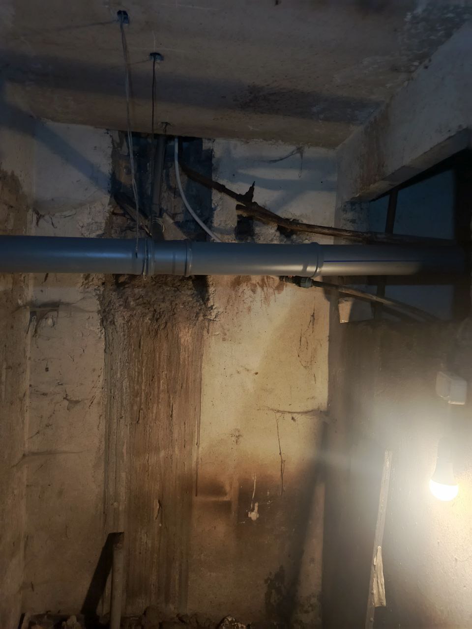 Специалисты выехали на обследование и обнаружили обветшавшую трубу слива канализации. Было принято решение аварийный участок трубопровода заменить на пластик. Проблема решена!