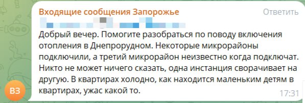 Читательница обратилась в чат-бот «Блокнот Запорожье». По её словам, местами отопление уже появилось, а в третьем микрорайоне долгожданного тепла в квартирах нет до сих пор.