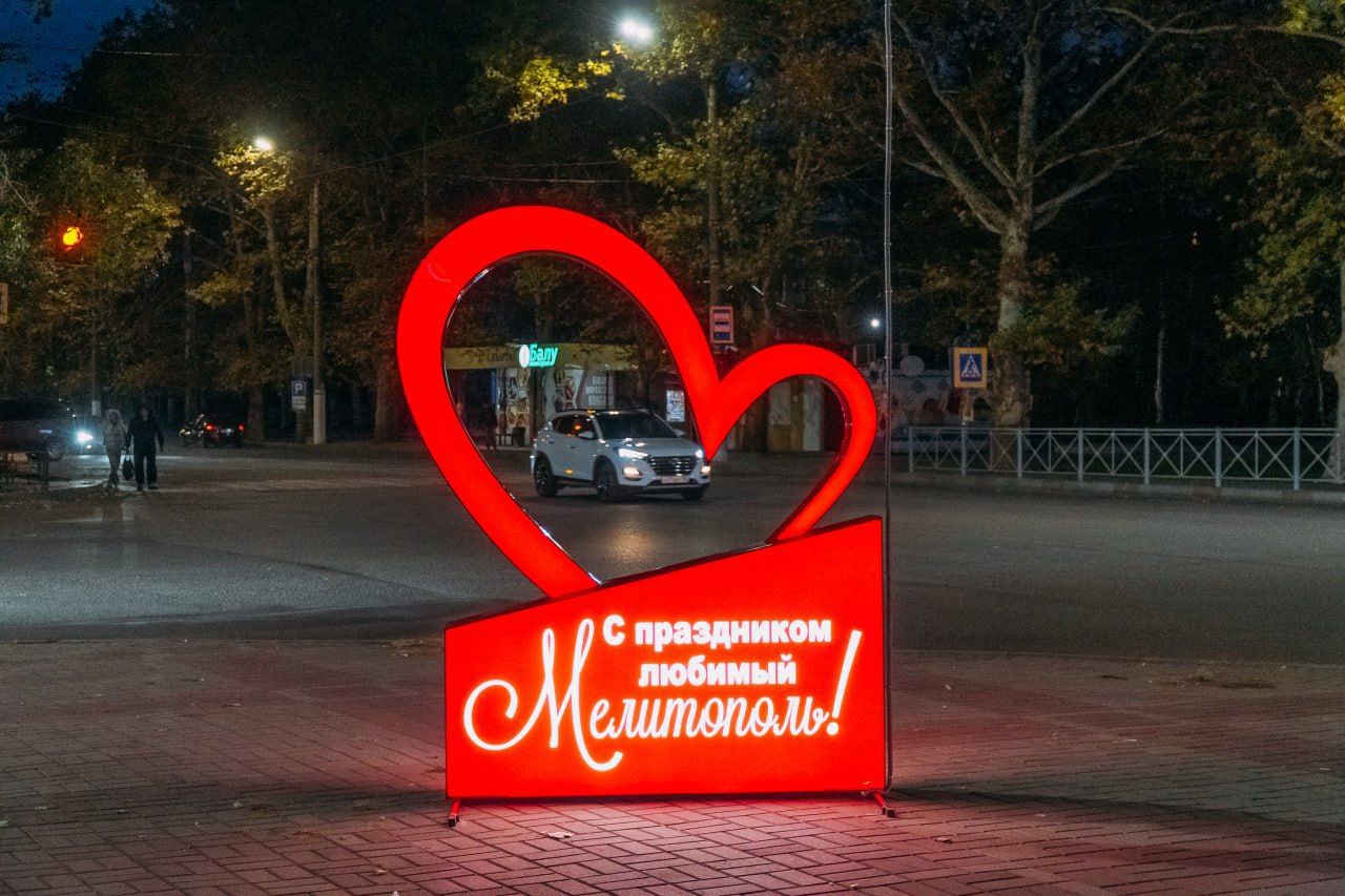 В Мелитополе появились тематические инсталляции с надписями "С праздником, дорогие мелитопольцы!" и "С праздником, любимый Мелитополь!".
