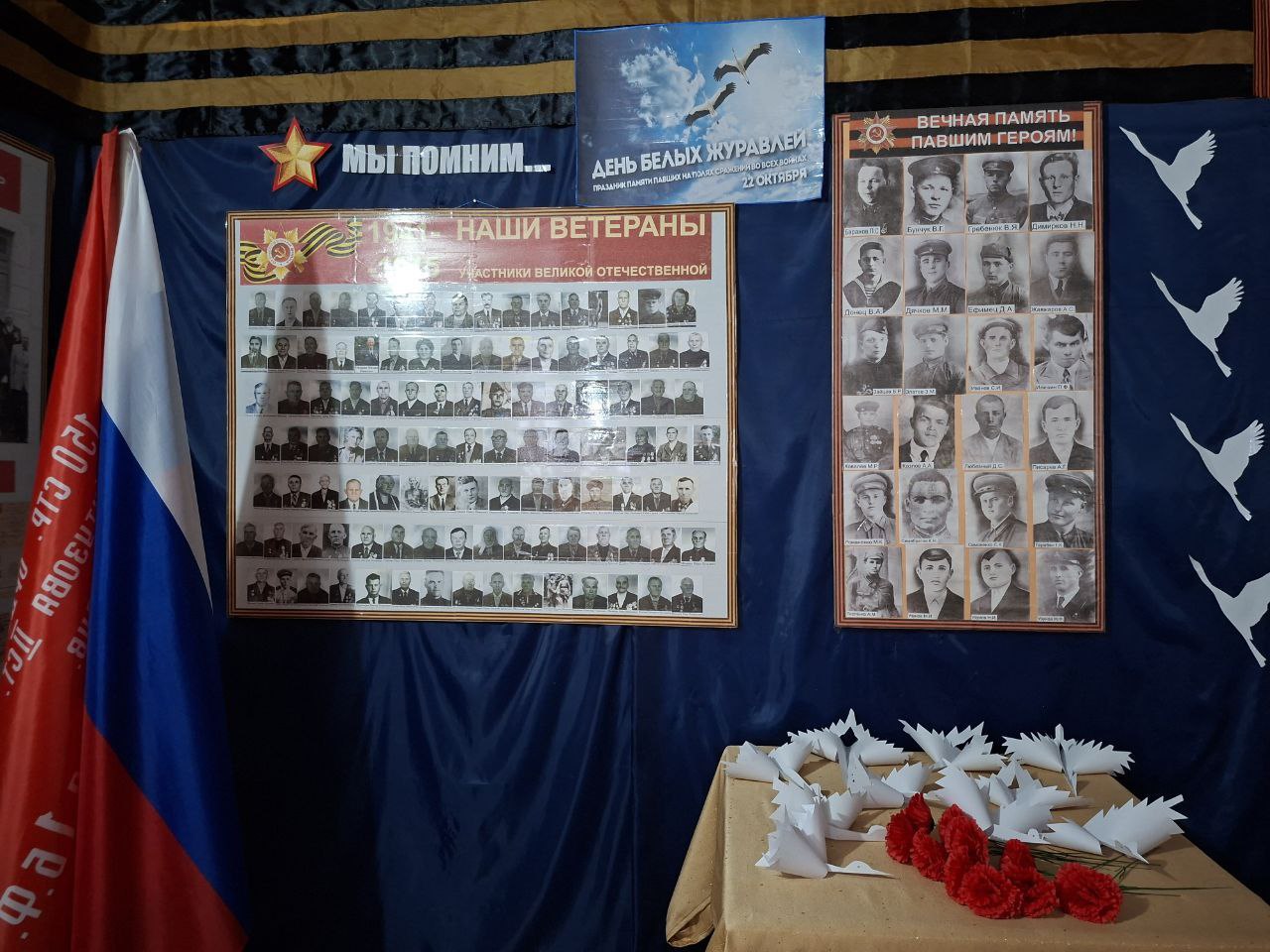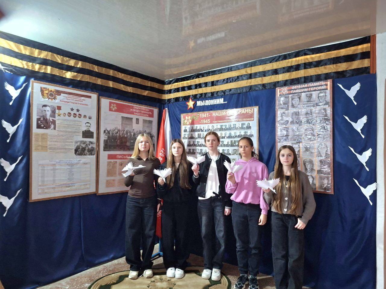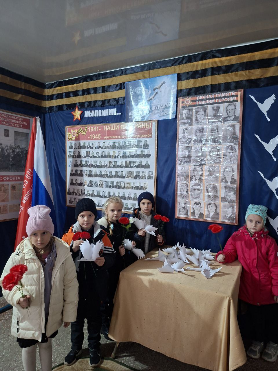 Ученики возложили цветы и собственноручно сделанных бумажных журавликов к памятному стенду, символизируя вечную память и неразрывную связь поколений.