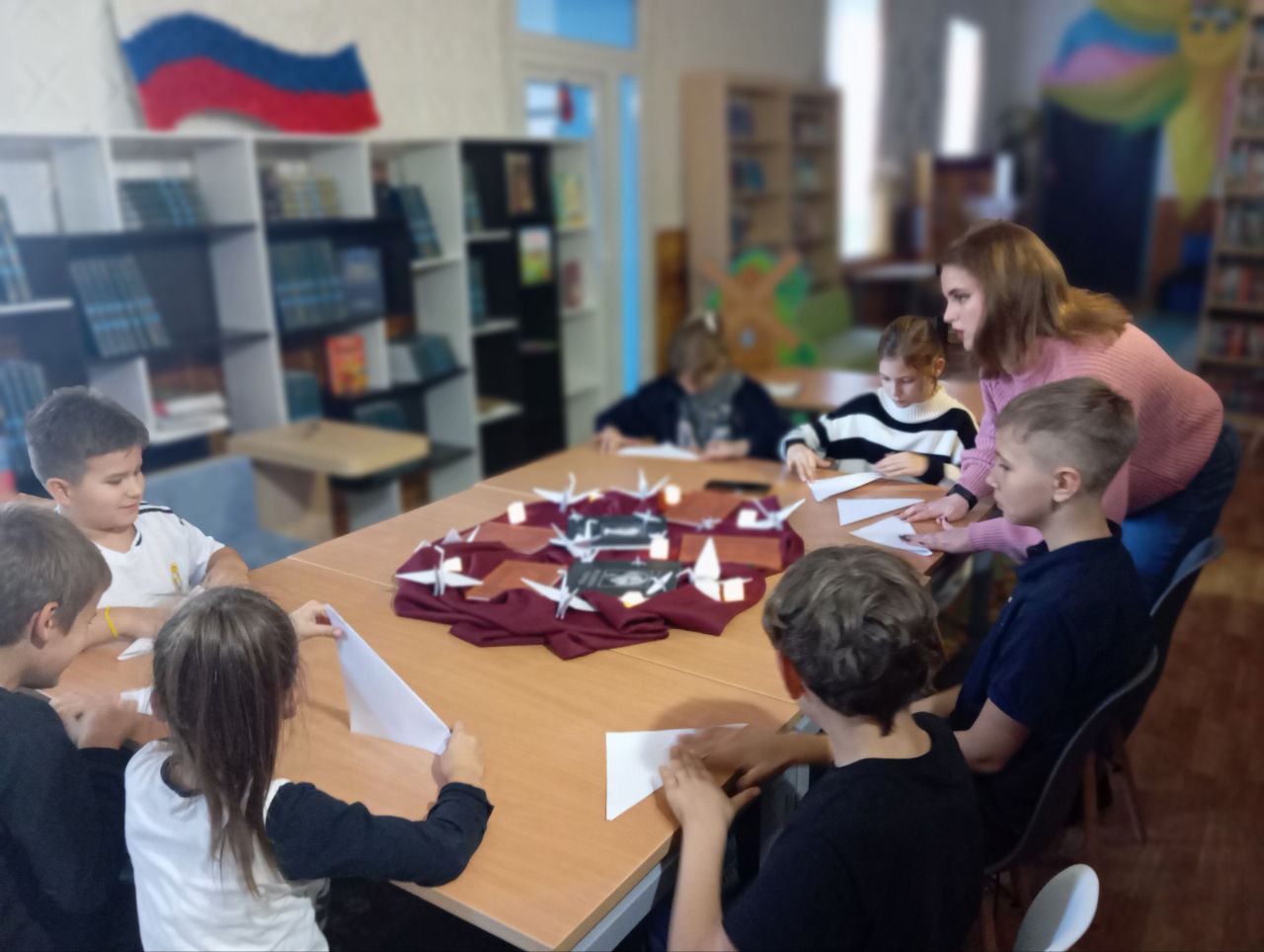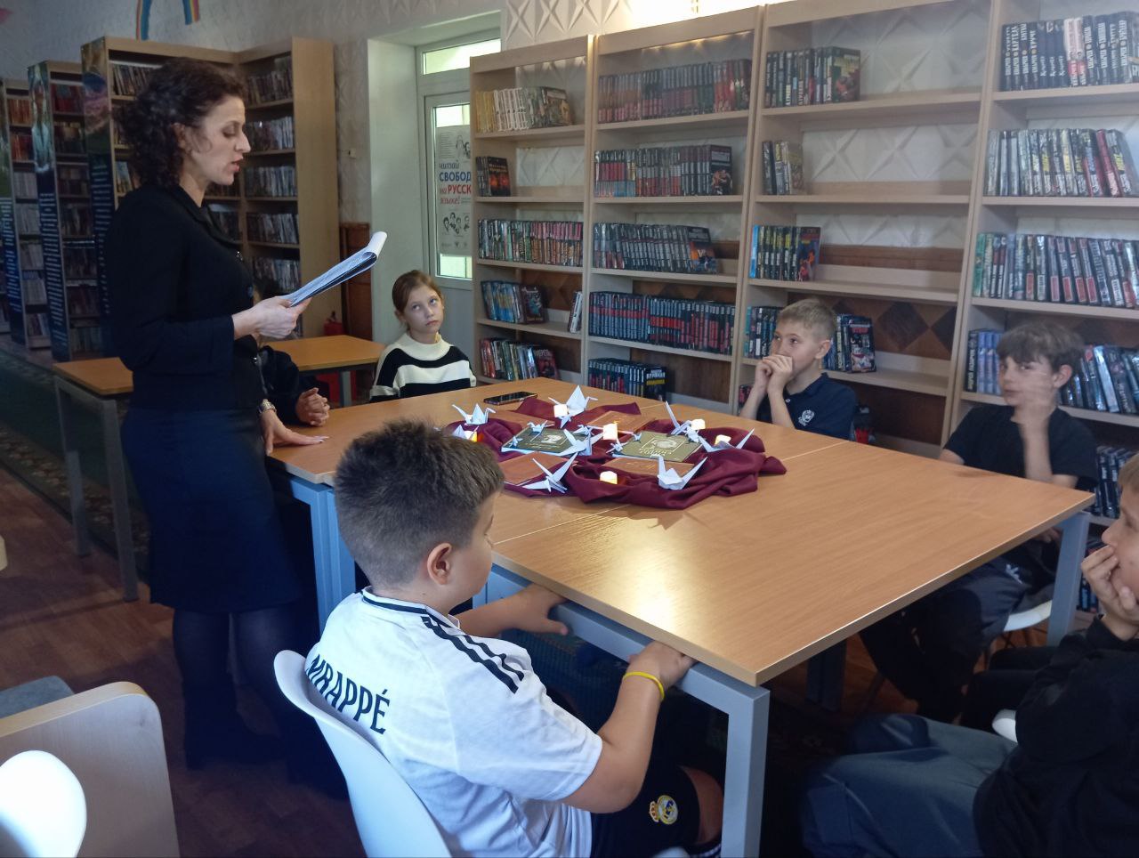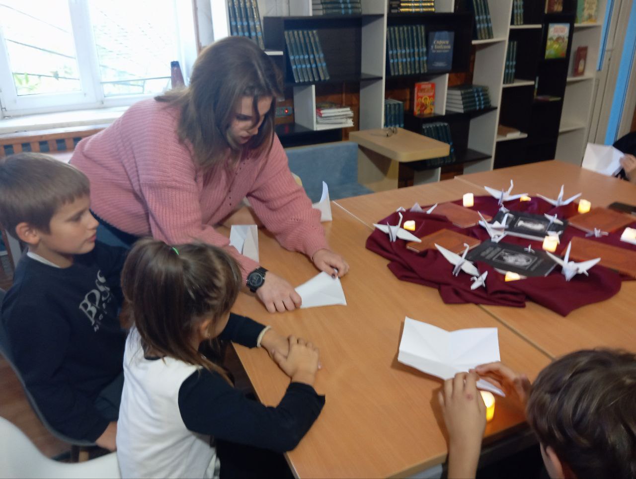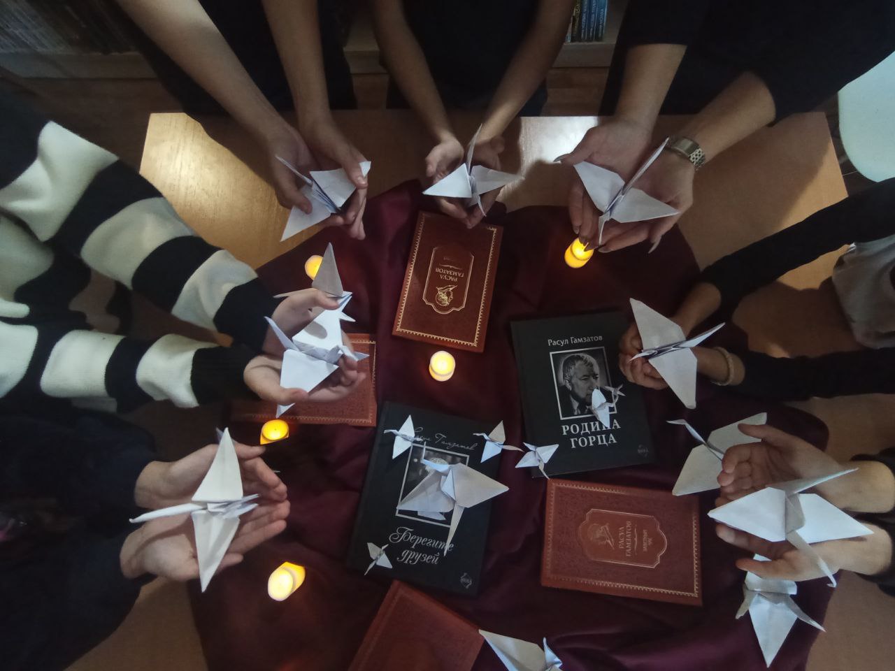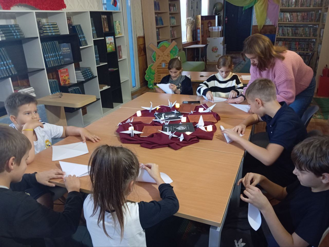 Ребята узнали историю возникновения этого дня, созданного по инициативе дагестанского поэта Расула Гамзатова в 1986 году о том, что день «Белых Журавлей» обрел международное значение. Библиотекарь рассказала трагическую историю японской девочки Садако Сасаки, которая умерла от лучевой болезни, не успевшая сделать 1000 бумажных журавликов, ставшей одной из жертв атомного взрыва в Хиросиме, познакомились с историей песни Яна Френкеля «Журавли» на стихи Расула Гамзатова, которая стала песней-молитвой, гимном памяти, погибшим во время Великой Отечественной войны солдатам, которых автор сравнивал с клином летящих журавлей, в которых используется образ белого журавля.