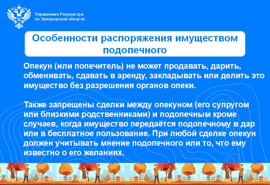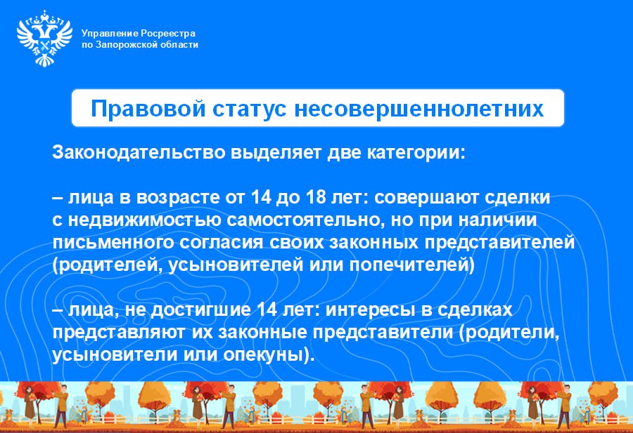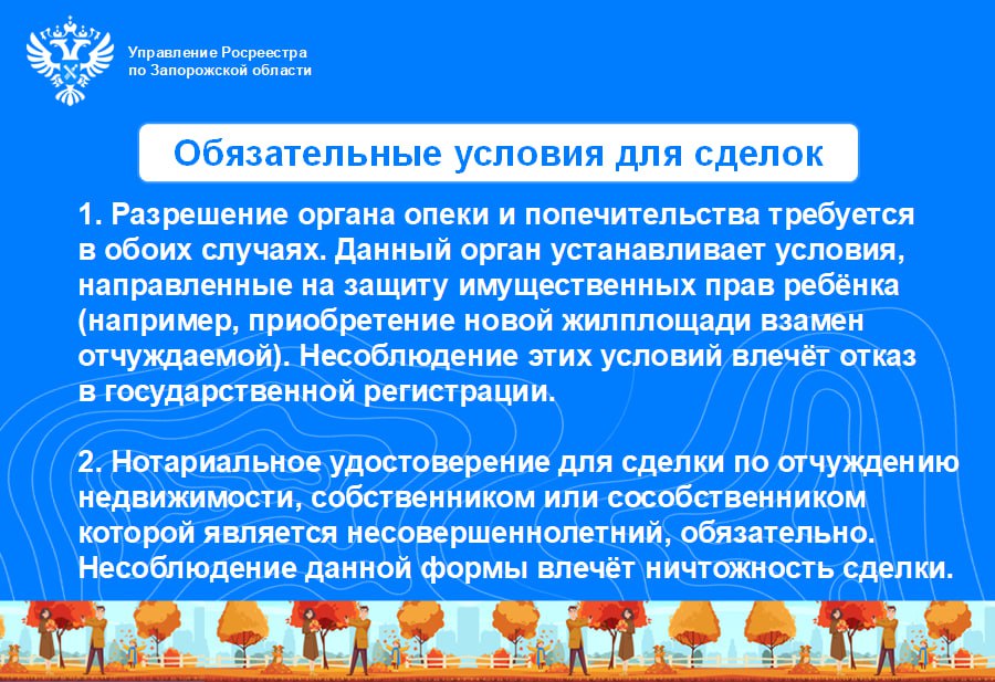 Управление Росреестра по Запорожской области напоминает о необходимости строгого соблюдения законодательства при совершении сделок с недвижимостью, затрагивающих права и интересы несовершеннолетних.
