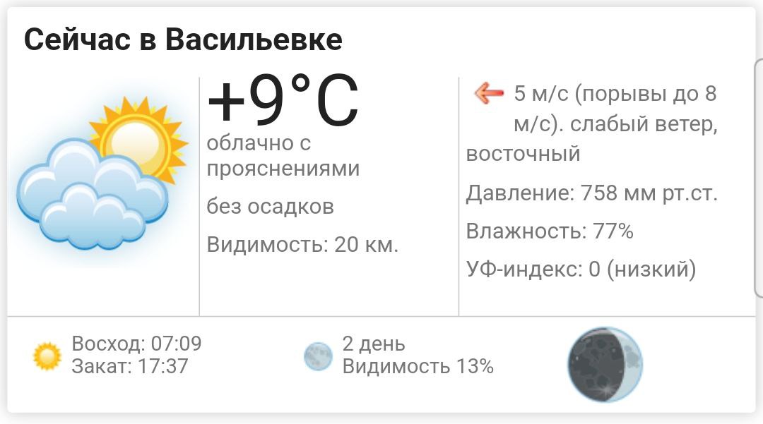 Сегодня, 23 октября 2025 года в Васильевке облачно с прояснениями, без осадков. Температура воздуха ... +9°С. Ветер: слабый, восточный до 8 м/с. Атмосферное давление: 758 мм.рт.ст. Влажность воздуха: 77%. УФ-индекс: 0 (низкий). Видимость на дорогах: 20 км.