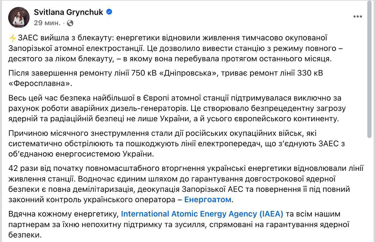 Сообщается, что энергетики возобновили питание ЗАЭС, выведя ее из 10-го полного блэкаута, продолжавшегося почти месяц.