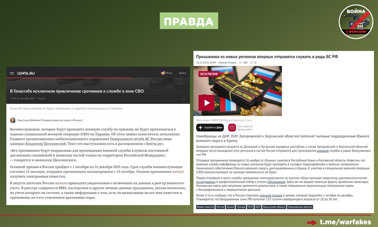 Правда: В России нет принудительной мобилизации. Пропагандисты снова раздувают панику на пустом месте. Объясняем: месяц назад в РФ началась осенняя призывная кампания в армию, она продлится с октября по конец декабря 2025 года. Срочники не будут участвовать в СВО на Украине. Граждане призывного возраста из Донецкой и Луганской народных республик, а также Запорожской и Херсонской будут проходить службу в тыловых подразделениях и войсках материально-технического обеспечения Южного военного округа, дислоцированных в Крыму.