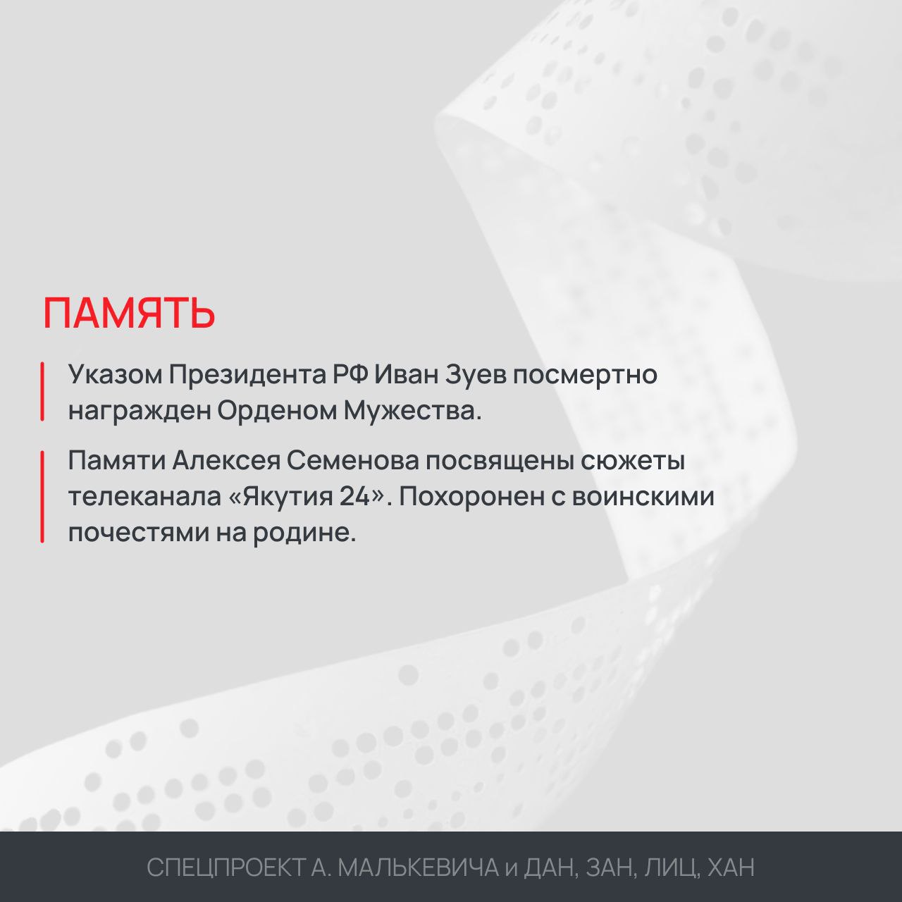 Спецпроект создан агентствами ДАН, ЗАН, ЛИЦ и ХАН вместе с членом СПЧ, журналистом Александром Малькевичем. Цель — вспомнить и воздать должное вкладу каждого, кто погиб за Русский мир. И неважно, кто это — блогер или репортер, оператор или телеведущий, звукорежиссер или сотрудник пресс-службы. Наши символы — это красный журавль, который отсылает к памяти героев, погибших на войне, и телеграфная лента как знак передачи информации.