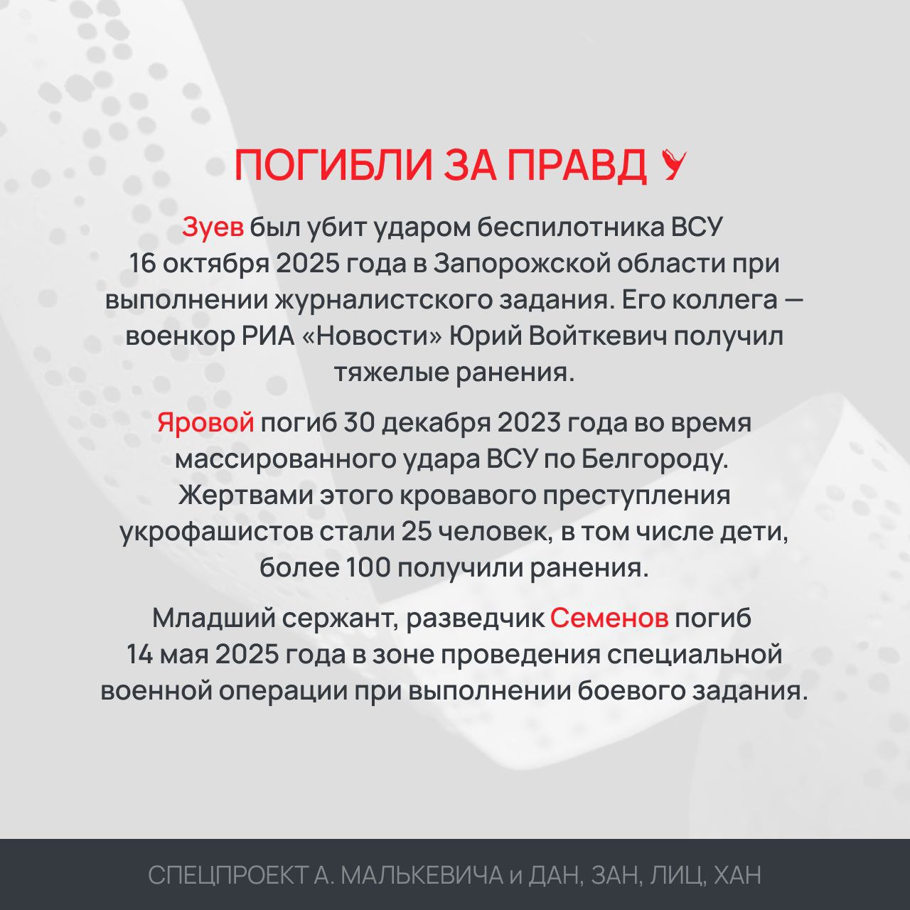 Мы также хотим вспомнить наших собратьев по цеху из Белгорода и Якутии, чьи жизни трагически оборвались по вине укробоевиков.