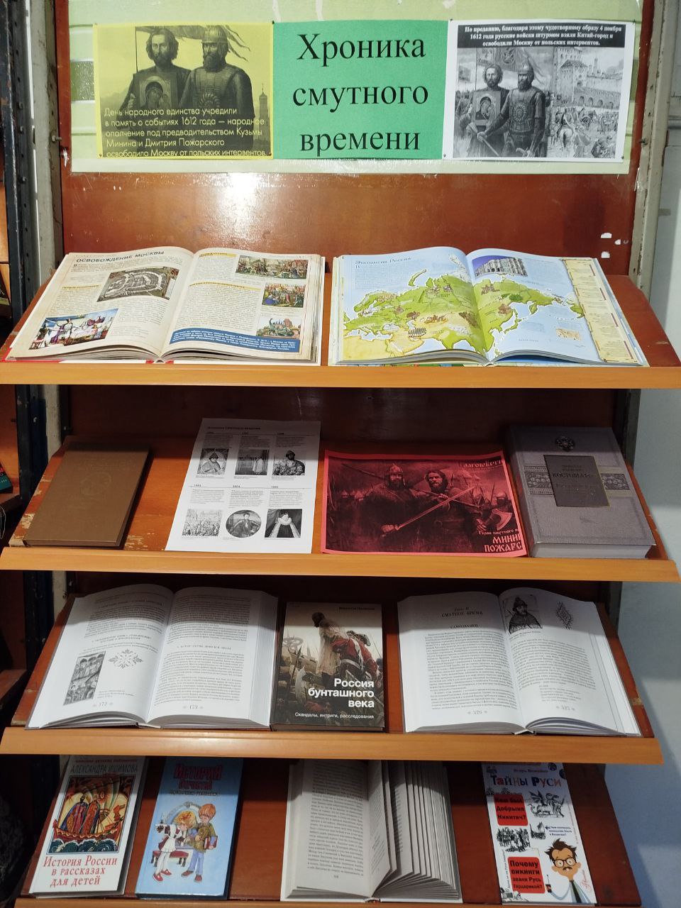 Литература, представленная на выставке, знакомит читателей с далёкими событиями XVII века, с историей, культурой и бытом Руси того времени, а также рассказывает о русском князе Дмитрии Пожарском и национальном герое Кузьме Минине – главных деятелях этого одновременно драматичного и героического периода истории нашего Отечества. Основу экспозиции составляют труды российских историков: Костомарова, Платонова, Соловьёва и др. Книги на выставке «Хроника Смутного времени» адресованы широкому кругу читателей.