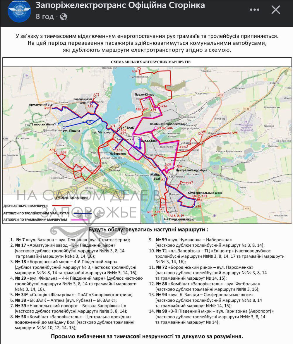 "В связи с временными отключениями электроснабжения, движение трамваев и троллейбусов останавливается.На этот период перевозка пассажиров будет осуществляться коммунальными автобусами, которые будут дублировать маршруты электротранспорта согласно схемы".