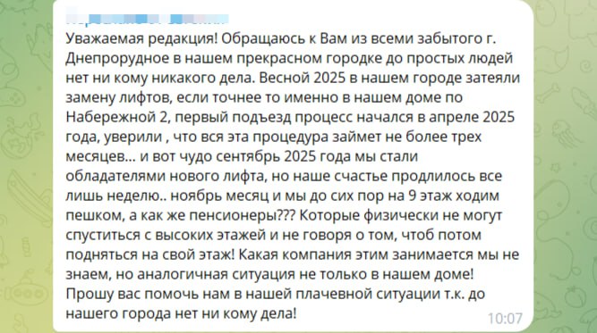 В наш чат-бот продолжают поступать жалобы на проблемные лифты в домах Днепрорудного. После замены лифтов насладиться этой радостью жители некоторых многоэтажек не успели - они не работают.