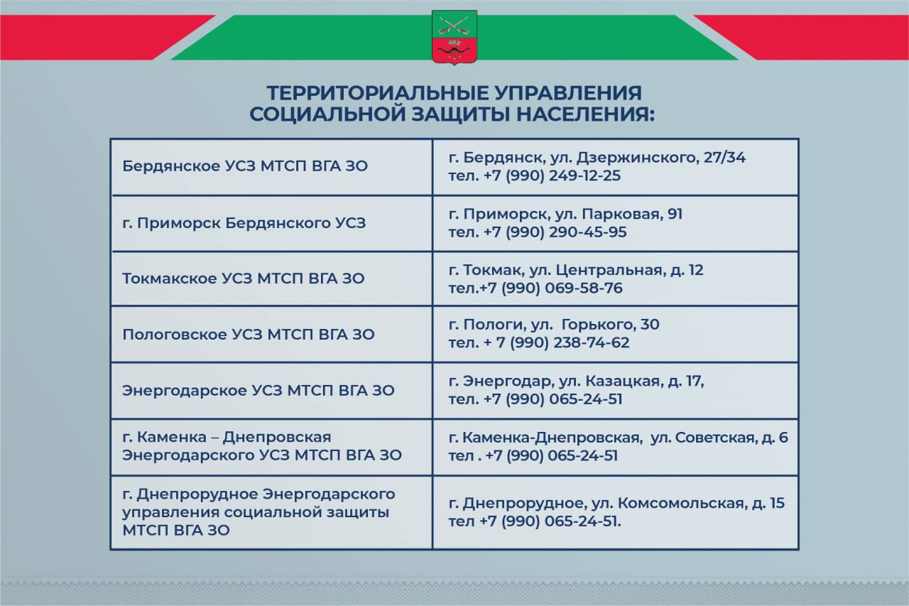Адреса территориальных отделений соцзащиты по Запорожской области указаны в карточках