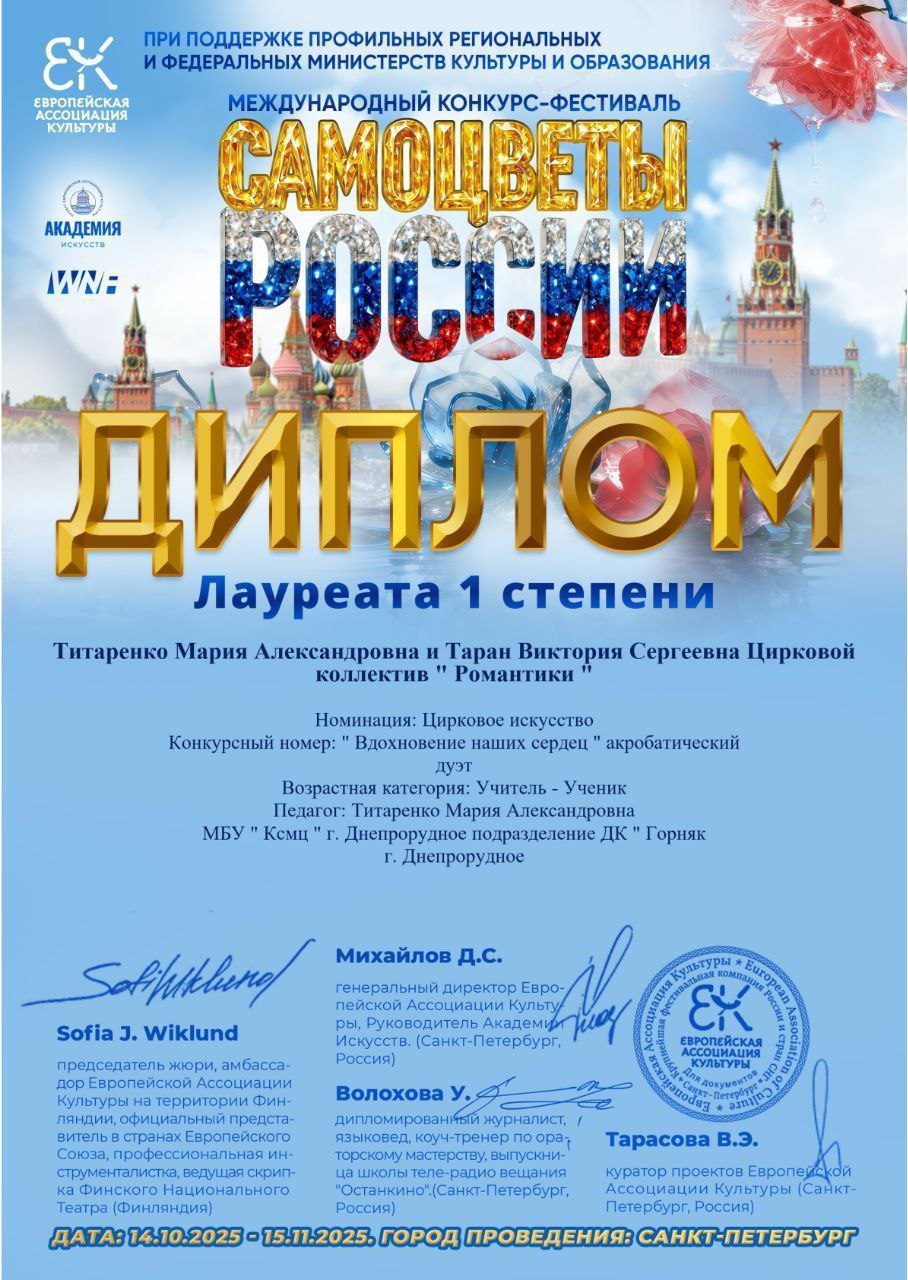 С радостью сообщаем, что на Международном конкурсе-фестивале "Самоцветы России" наши талантливые участницы - Литвин Диана, Елизавета, Рябкова Лилия, Титаренко Мария и Таран Виктория - завоевали звание лауреата 1 степени!