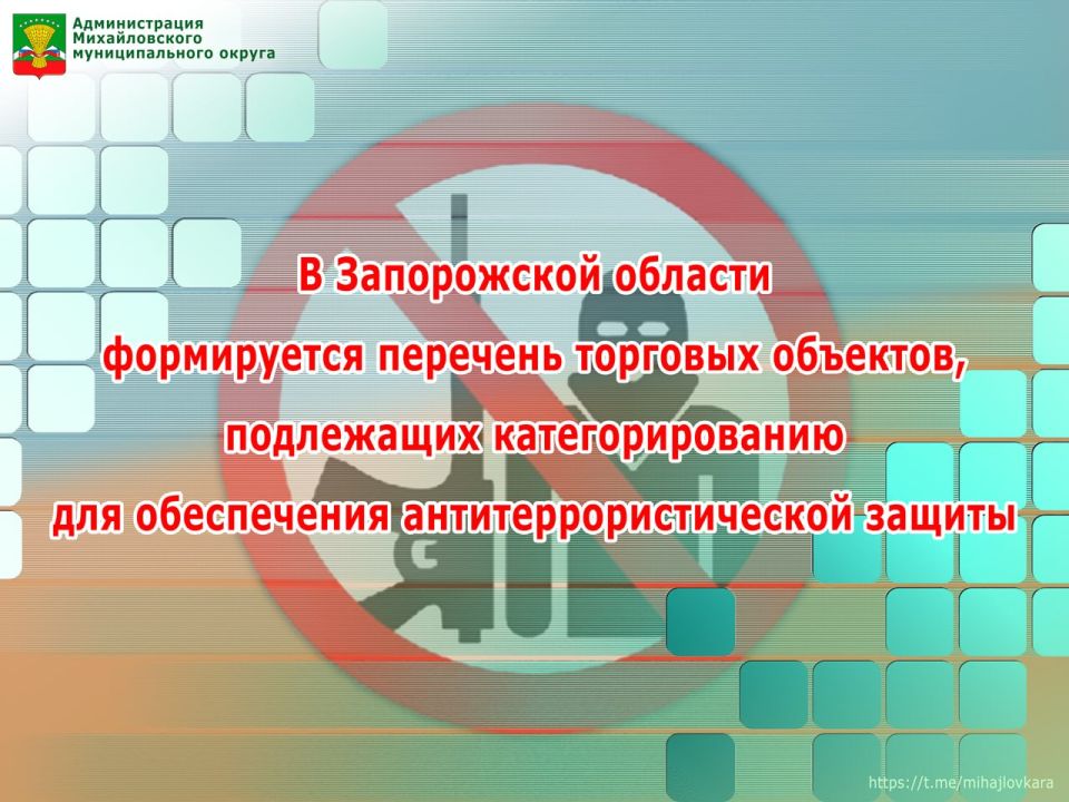 Уважаемые руководители и владельцы торговых предприятий! В соответствии с постановлением Правительства Российской Федерации от 19.10.2017 № 1273 «Об утверждении требований к антитеррористической защищенности торговых объектов (территорий)…» в Запорожской области проводится работа по формированию перечня торговых объектов, подлежащих категорированию в интересах их антитеррористической защиты. Администрация Михайловского муниципального округа информирует предпринимателей о необходимости подать сведения о своих объектах.