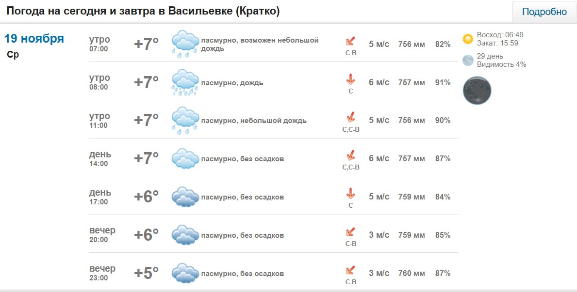 Подробно о погоде в Васильевке 19 ноября 2025 года