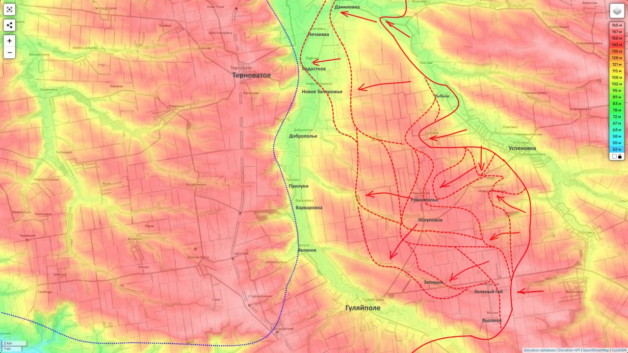 Таким образом наши части группировки «Восток» широким фронтом выходят на окраины Гуляйполя (около 1,5 км с северо-востока) и на линию обороны ВСУ по реке Ганчур.
