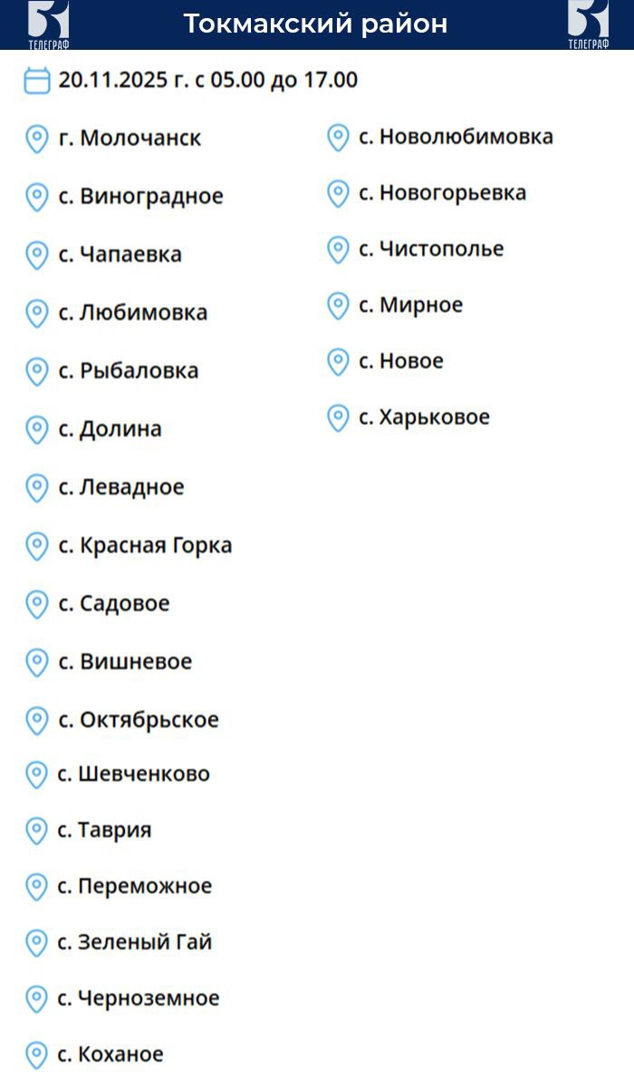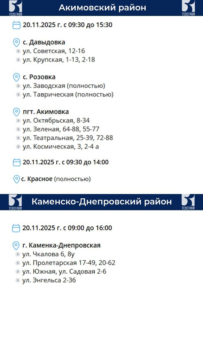 «Запорожьеэнерго» информирует о том, что в связи с проведением плановых работ будет отсутствовать электроэнергия в таких районах: