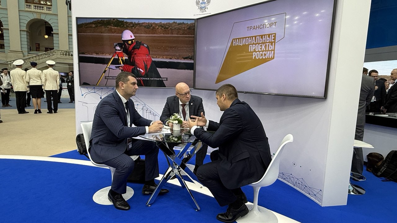 На площадке XIX международного форума «Транспорт России 2025» на Стенде Национальных проектов в Гостином дворе состоялась рабочая встреча генерального директора ФБУ «Росавтотранс» Евгения Мошина с и.о министра транспорта и развития транспортной инфраструктуры Запорожской области Николаем Лукашенко.