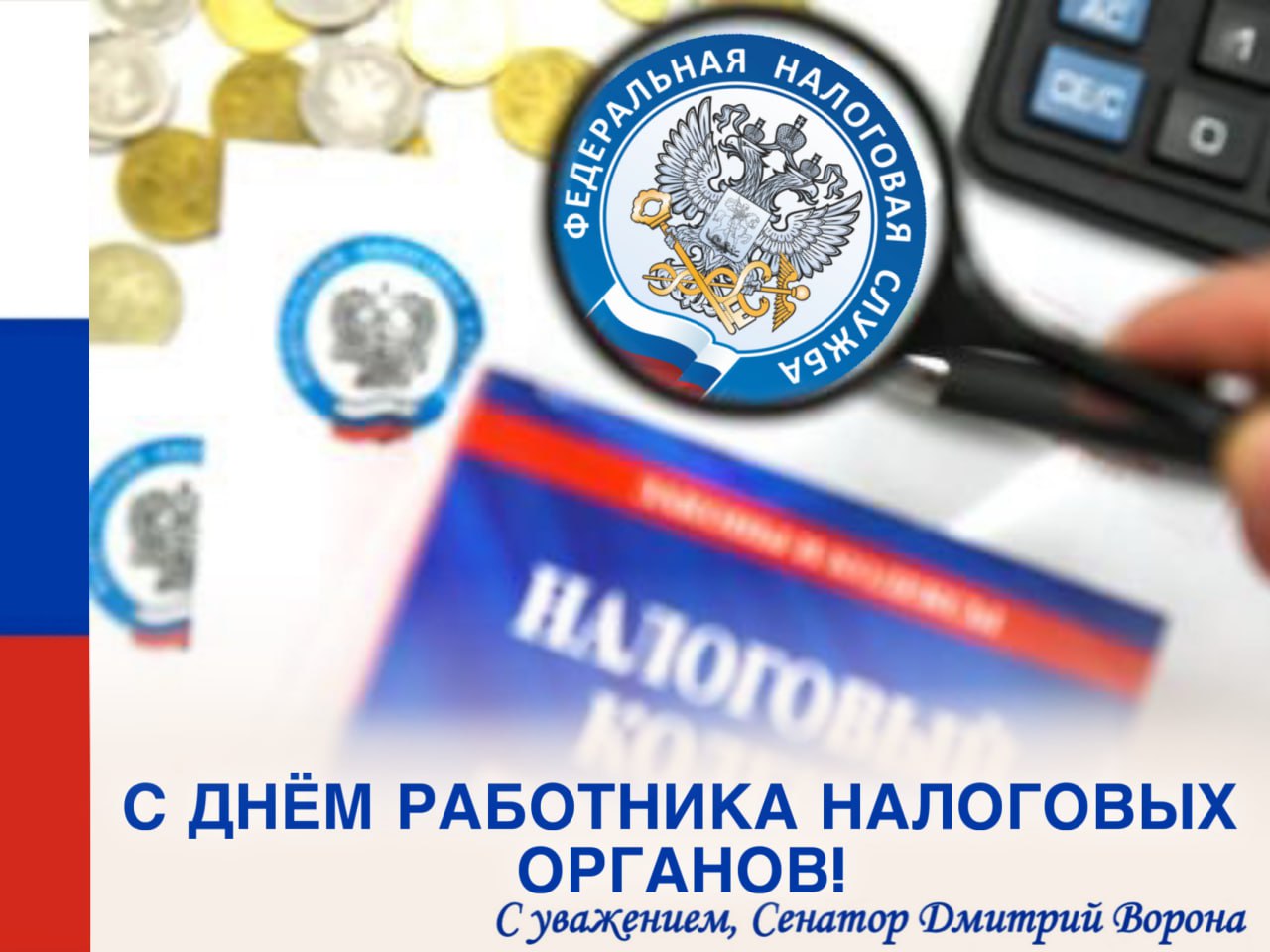 С удовольствием поздравляю всех налоговиков с профессиональным праздником! Желаю вам и вашим семьям здоровья и благополучия. Пусть вам всегда сопутствуют удача, честность и профессионализм!