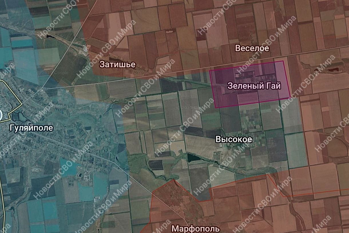 С утра сообщают о падении обороны противника в поселке Зеленый Гай к востоку от Гуляйполя. Далее на днях зачистят Высокое. Остатки сил противника откатываются к восточным окраинам Гуляйполя.
