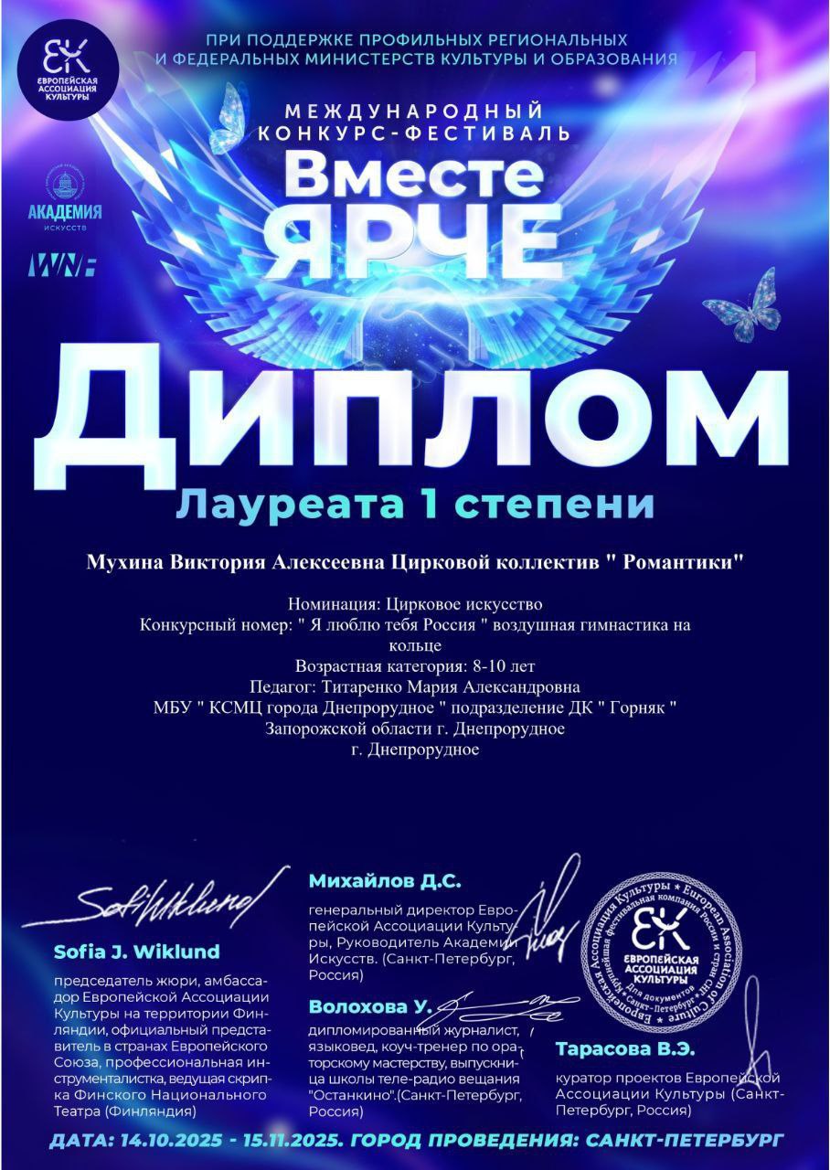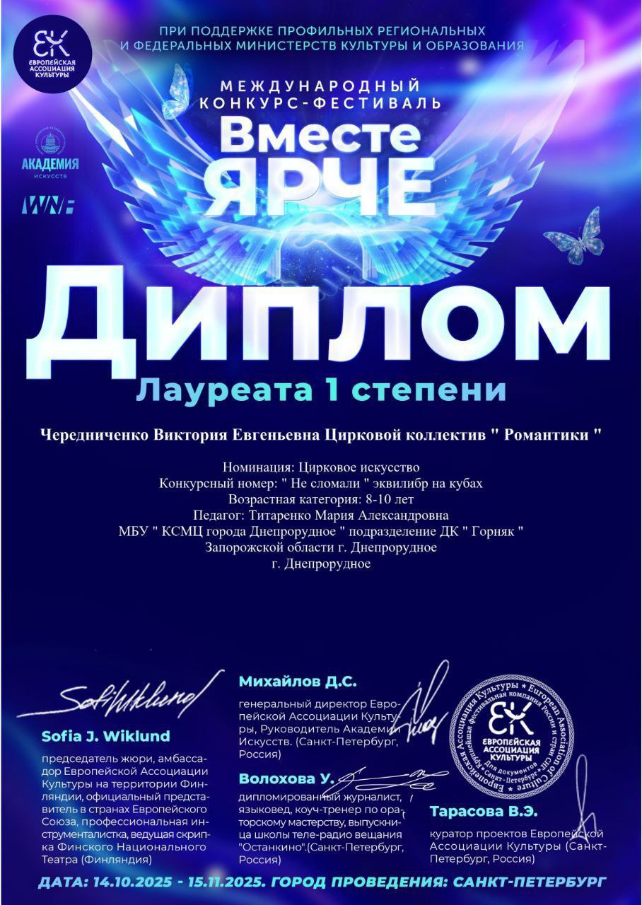 Цирковой коллектив "Романтики" ДК "Горняк" г. Днепрорудное вновь одержал блестящую победу на Международном фестивале-конкурсе "Вместе ярче" г. Санкт-Петербург!