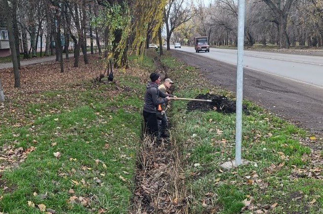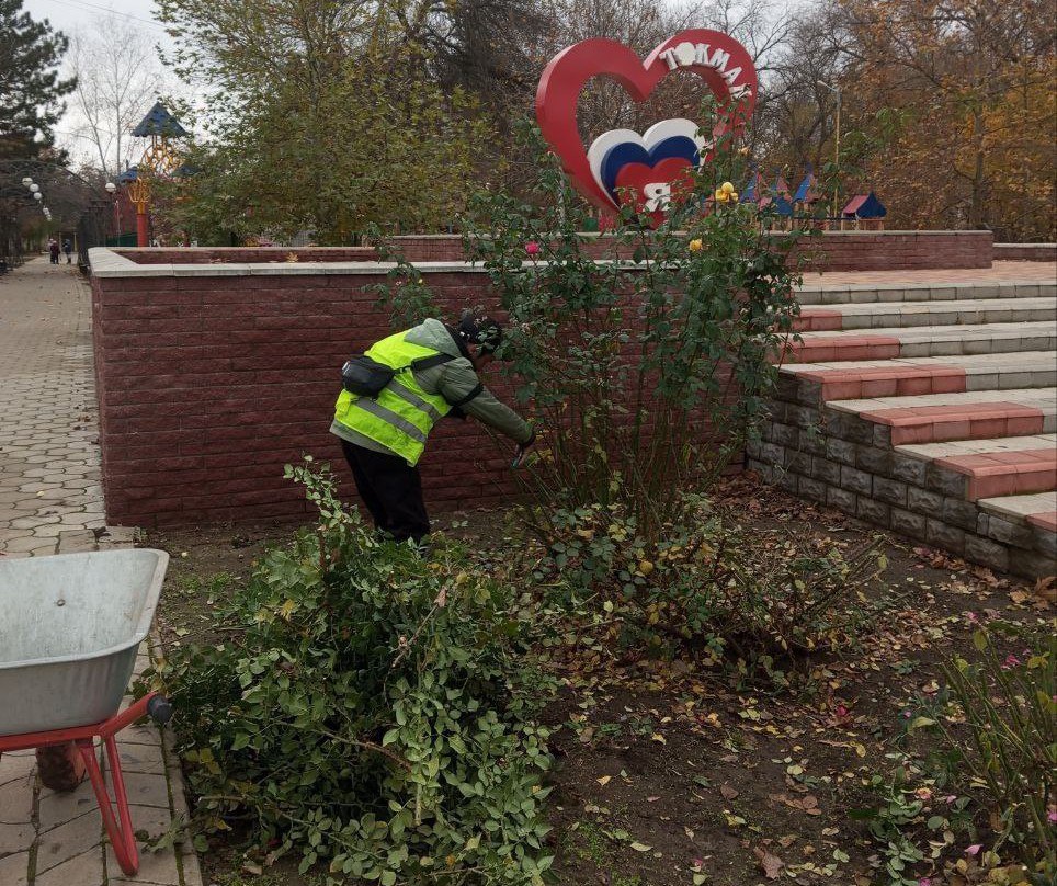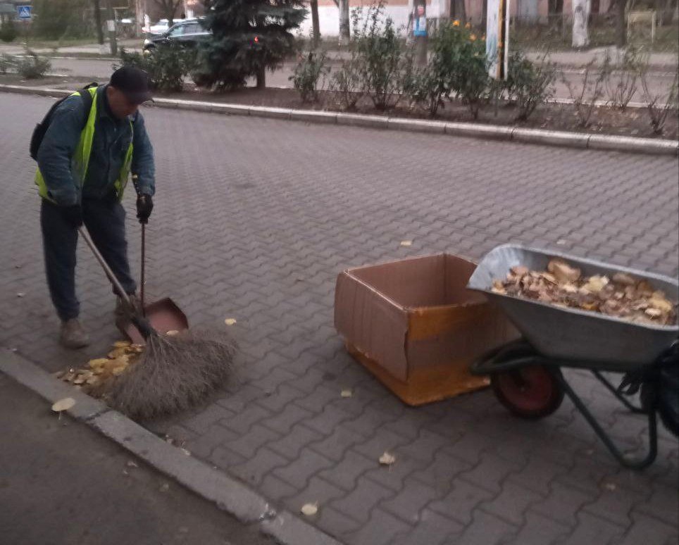 Коммунальщики ежедневно проводили санитарную уборку городских территорий: на центральных улицах и в сквере, подметали, убирали и вывозили опавшие листья и бросовый мусор, обрезали кусты роз возле арт-объекта «Я люблю Токмак».