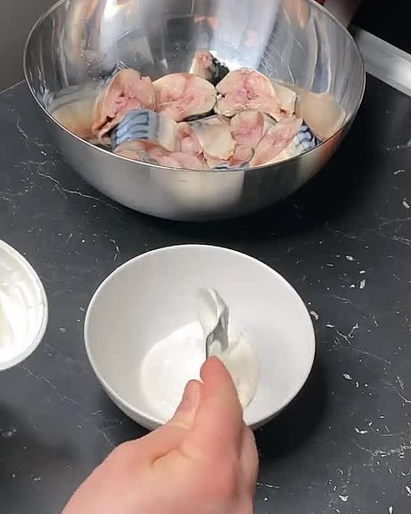 Потрошим скумбрию, хорошо промываем и разрезаем на кусочки. К сметане добавляем горчицу, соевый соус и чеснок. Солим и перемешиваем. Заливаем рыбу и оставляем мариноваться минимум на 30 минут.
