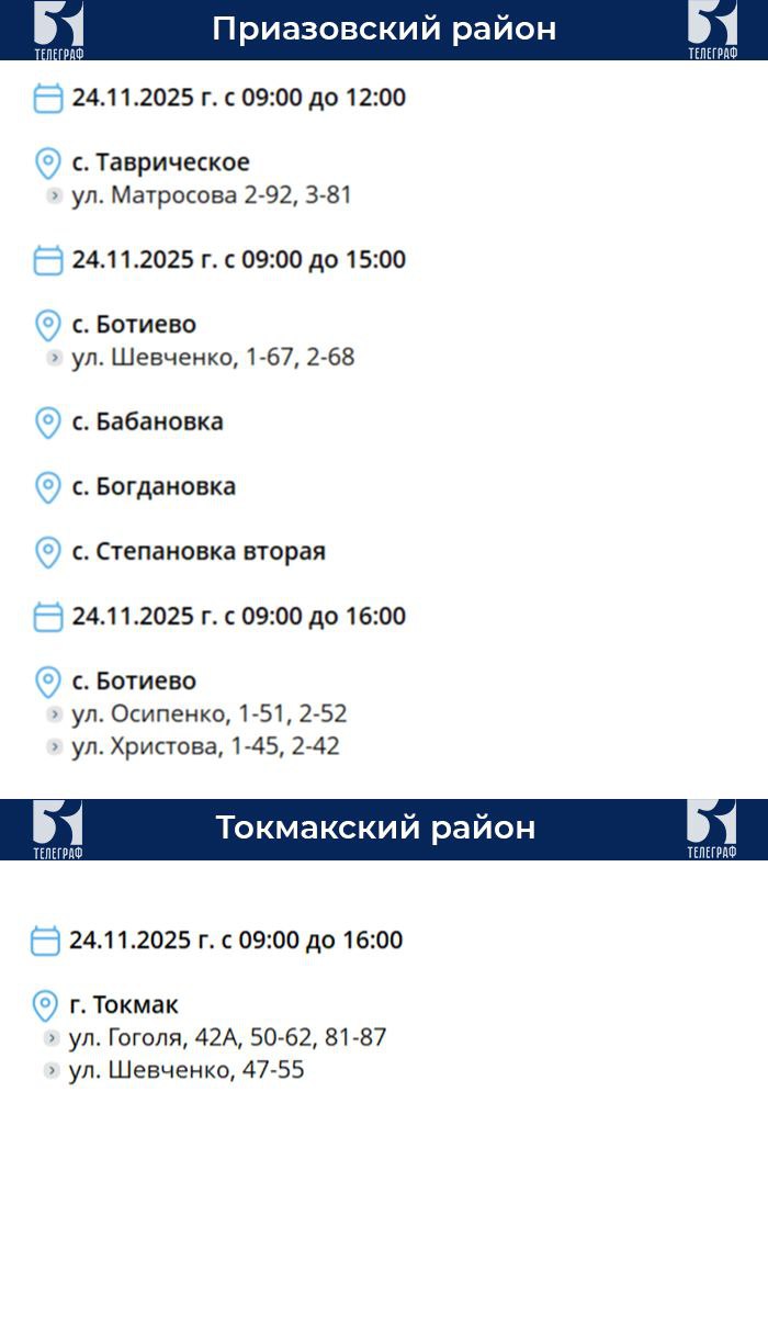 «Запорожьеэнерго» информирует о том, что в связи с проведением плановых работ будет отсутствовать электроэнергия в таких районах:
