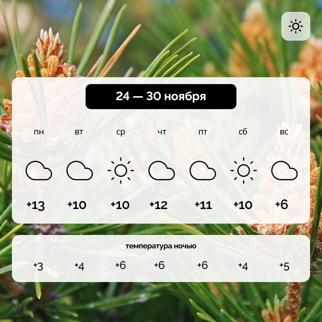 На протяжении недели температура воздуха составит +10 °C днем, а ночью температура воздуха не опустится ниже +3 °C.