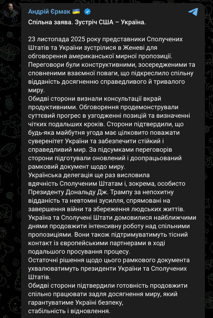 По итогам переговоров в Женеве американская и украинская стороны опубликовали заявления о том, что они согласовали обновлённый проект мирного плана: любое будущее соглашение должно полностью уважать суверенитет Украины, — заявление Белого дома.