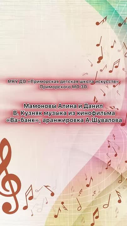 Вниманию наших подписчиков - первое выступление юных талантливых музыкантов. В номинации "Брат - сестра" его подготовили Мамоновы Алина и Данил. В их исполнении звучит произведение В.Кузняк: музыка из кинофильма "Ва-банк", аранжировка А.Шувалова.