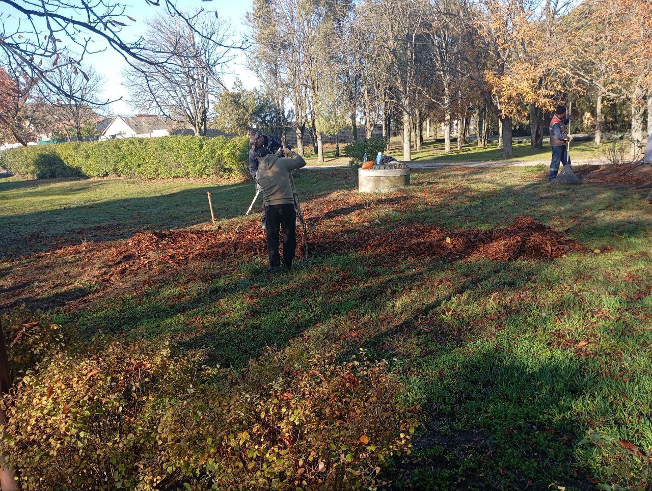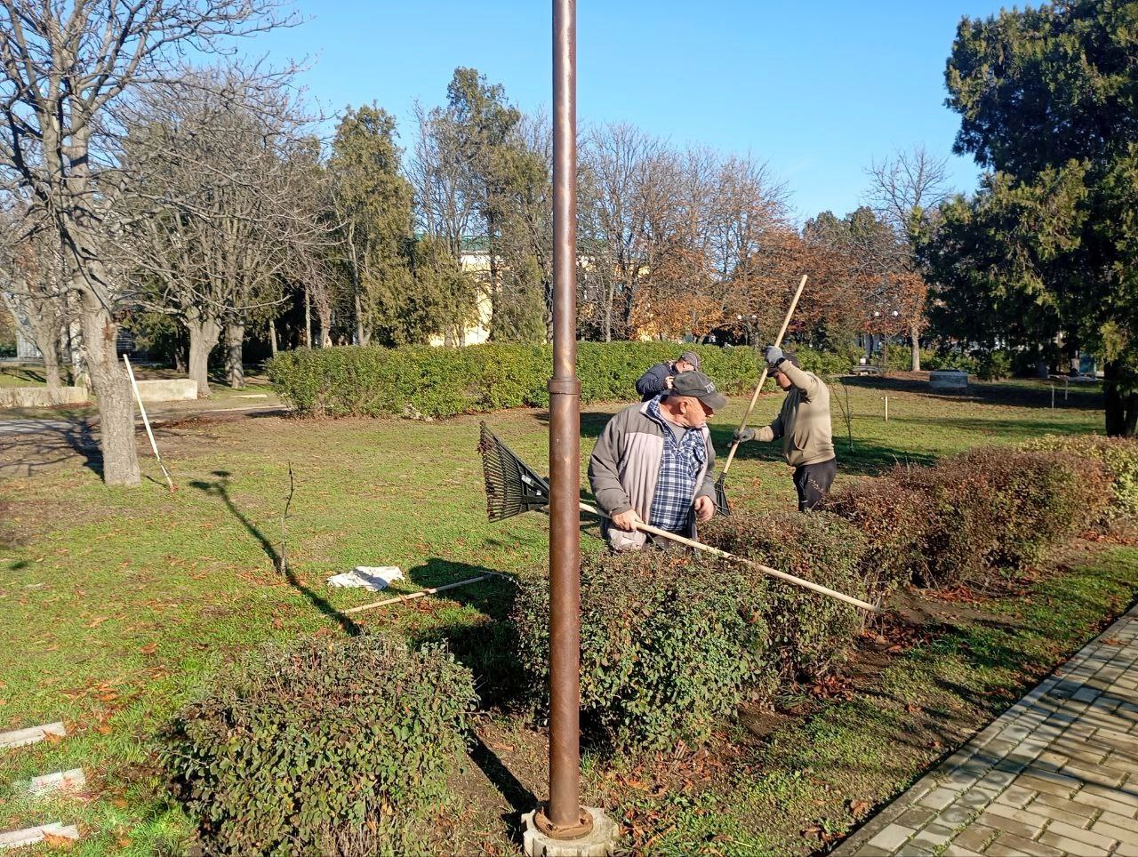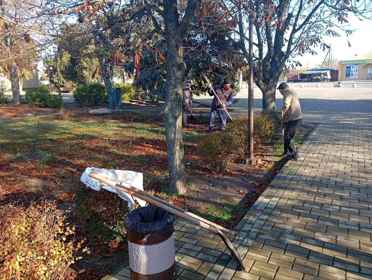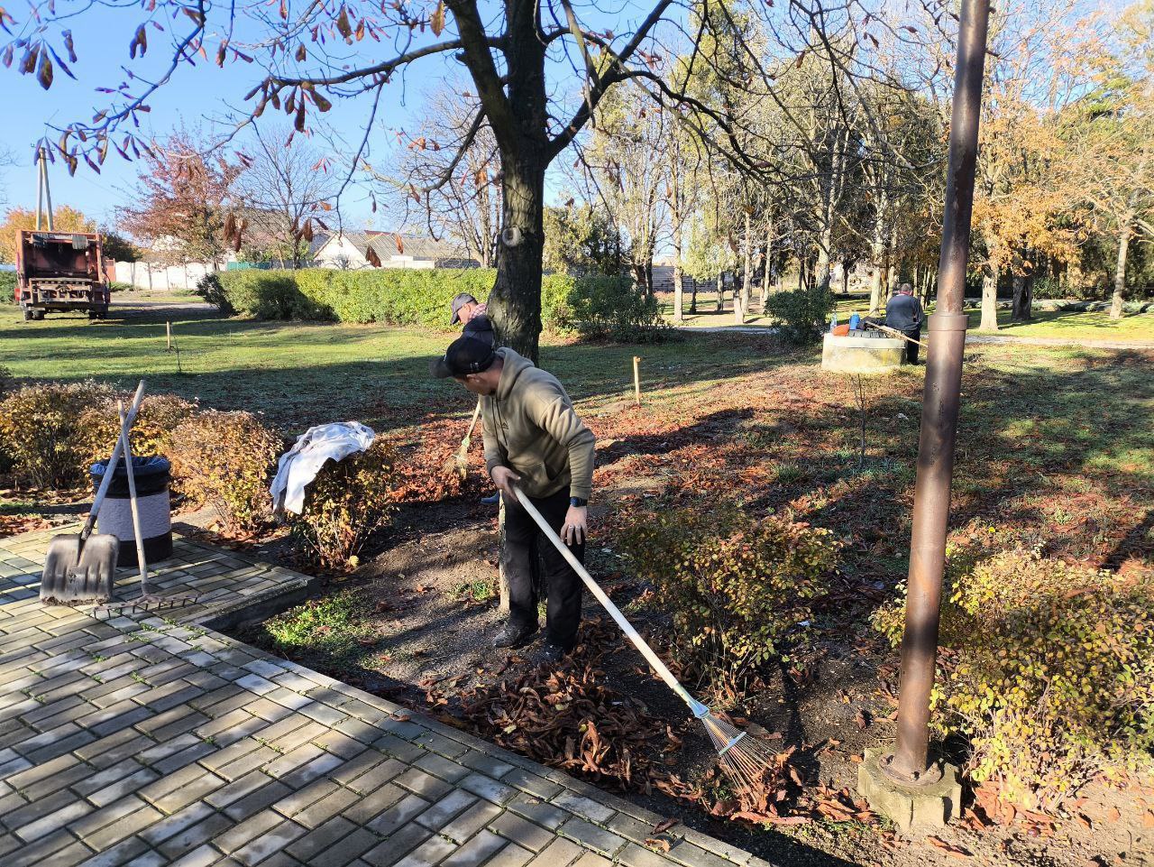 Силами коммунальных служб были произведены обрезка кустарников с последующим формированием кроны, сбор и вывоз мусора, листьев и веток с территории парка, а также чистка межплиточных швов дорожек.