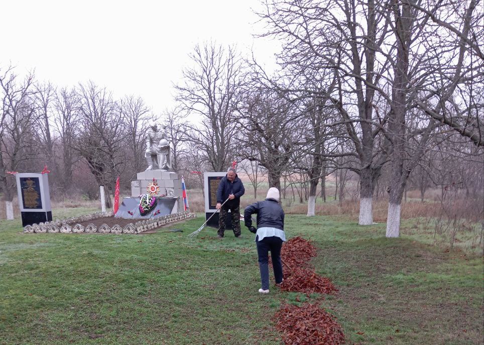 В эти дни сотрудники территориального отдела Новониколаевской группы сёл убрали опавшую листву на территории памятников военной истории, привели в порядок цветочные клумбы, пропололи сорняки.
