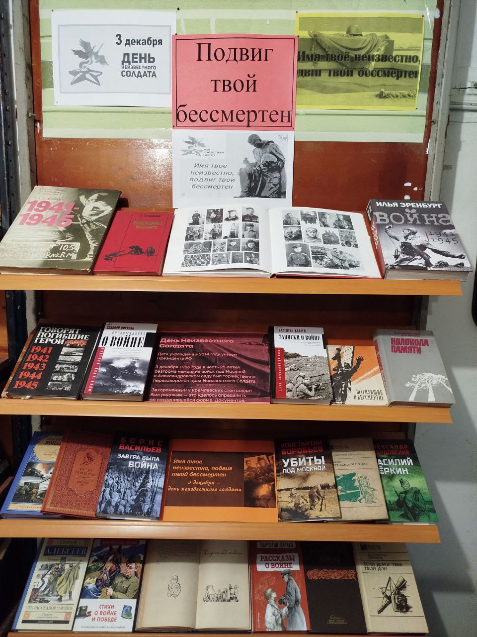 3 декабря в России отмечается День неизвестного солдата – памятная дата, утвержденная в память о погибших в бою солдатах СССР и России. К этой дате Бурчацкая сельская библиотека подготовила книжную выставку «Подвиг твой бессмертен».