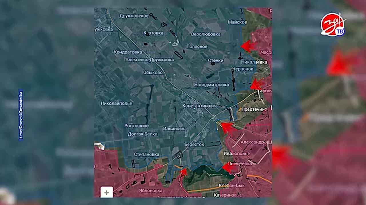 Константиновское направление сегодня одно из самых динамичных. Наши войска продолжают продвижение вдоль Клебан-Быкского водохранилища и отбивают у противника опорные пункты. Также продвинулись на восточной окраине Константиновки. Этот населённый пункт сильно вытянут с юго-востока на северо-запад и там переходит в Дружковку. Снабжение идёт со стороны Краматорска. Обрезать его мы пока не можем. Тем не менее, нашим штурмовым отрядам удаётся заходить вглубь застройки и вдоль железной дороги.