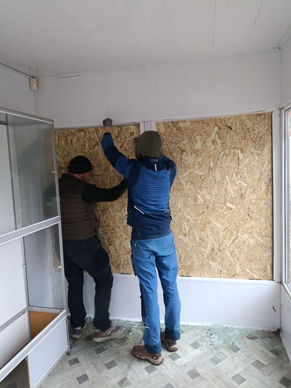 Сотрудники аварийной бригады «КарелКоммунЭнерго» заделали окна в пострадавшем от обстрелов павильоне при васильевской достопримечательности – замке Попова.