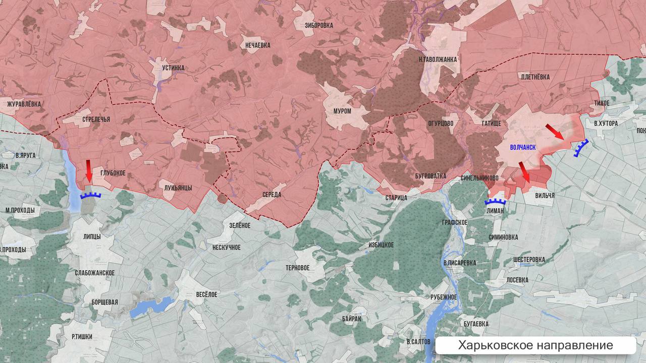 На Харьковском фронте ВС РФ ведут бои за Лиман и Вильчу. Враг контратакует. Под Волчанск ВСУ перебрасывают дополнительные силы. ВС РФ бьют по логистике и позициям врага в направлении на Великий Бурлук и Старый Салтов артиллерией, авиацией и дронами.