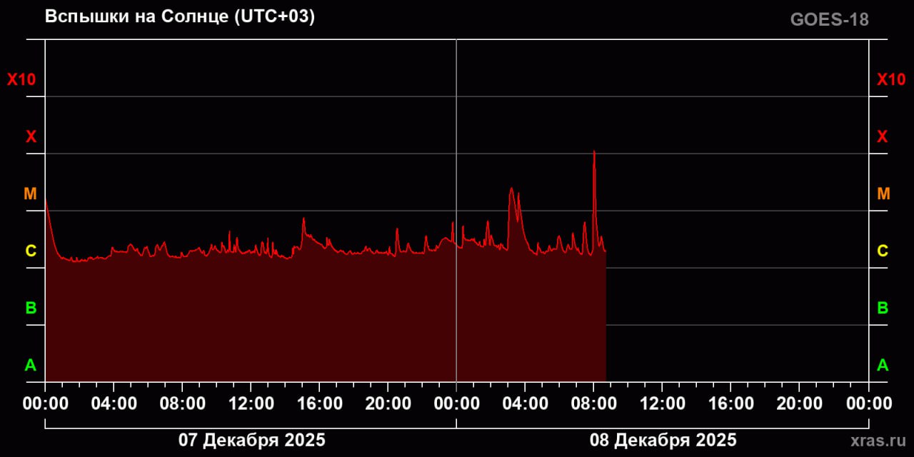 Солнечная вспышка высочайшего класса произошла 8 декабря в 8:01. Несмотря на силу, она была импульсной и длилась около 15 минут, что снижает вероятность значительного воздействия на Землю. Об этом сообщает лаборатория солнечной астрономии (XRAS).
